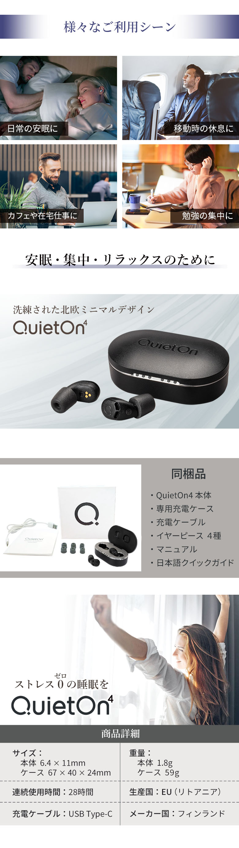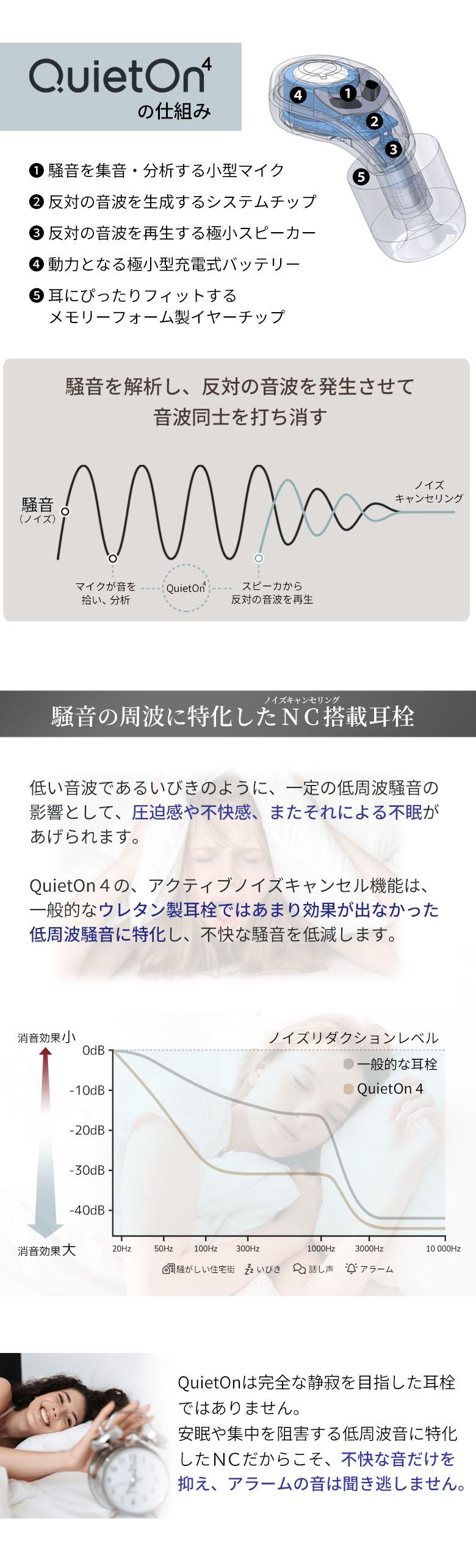 QuietOn4 は、高性能ノイズキャンセル機能を搭載した デジタル耳栓です。