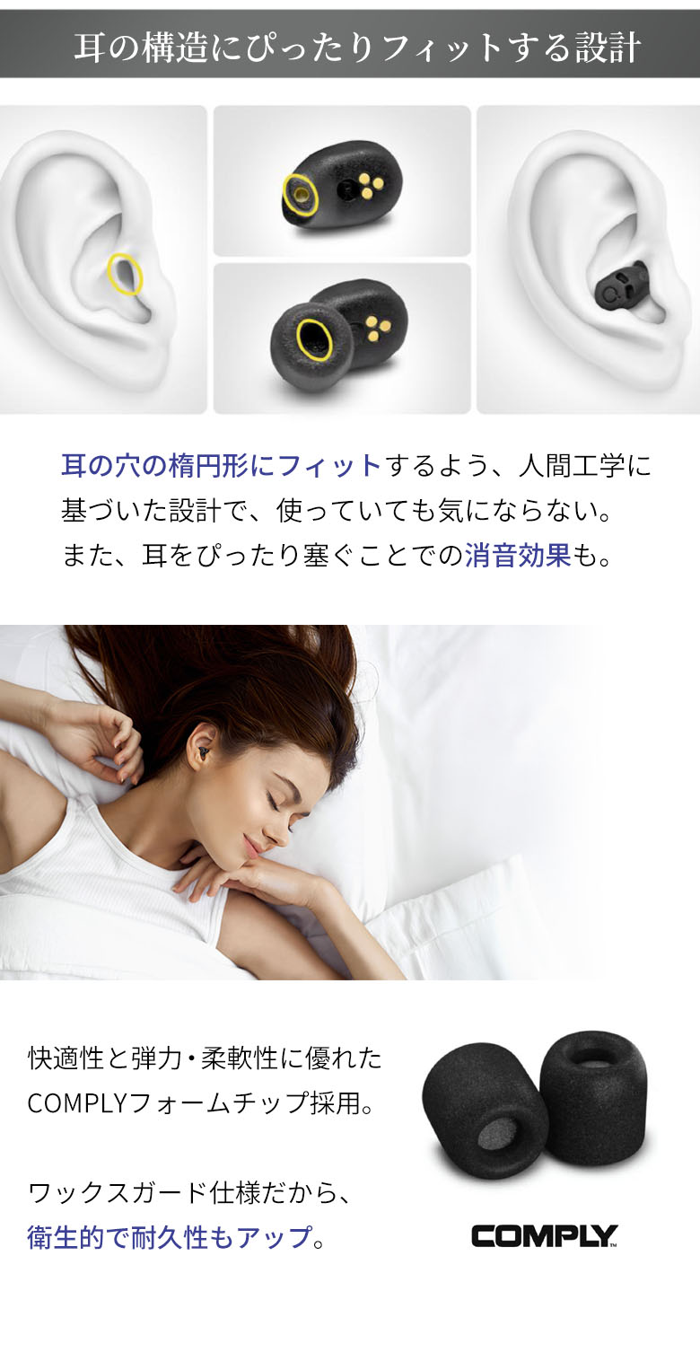 パートナーのいびき、近所の生活音、道路の交通騒音など、安眠や集中の妨げとなる騒音を大きく緩和。