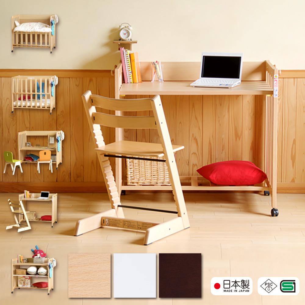 ■収納棚 ・天板の高さ (床から120、470、737mm) ・4輪キャスター付 ・ハンガー掛け(左右2個ずつ) ・組立式 ・耐荷重:静止状態で60kg(生後24ヶ月以内の乳幼児が対象です。同時に二人で使用したり、腰掛けたり、ぶら下がったりしないでください。) ・生産国:日本