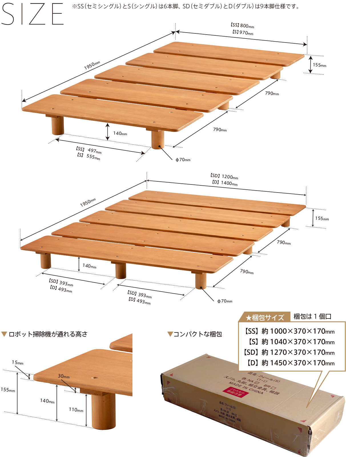 サイズ = SS(セミシングル)・S(シングル)・SD(セミダブル)・D(ダブル)