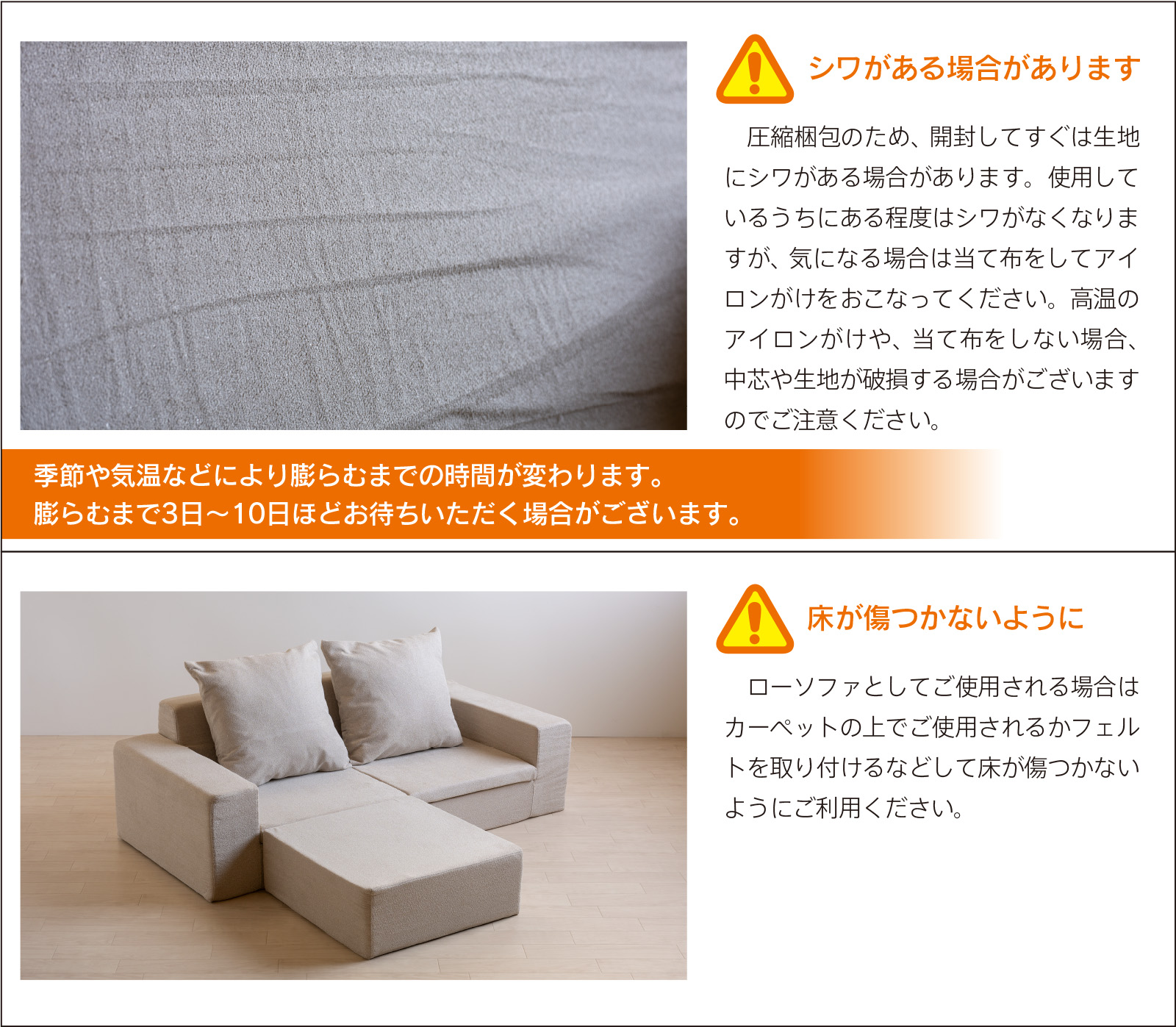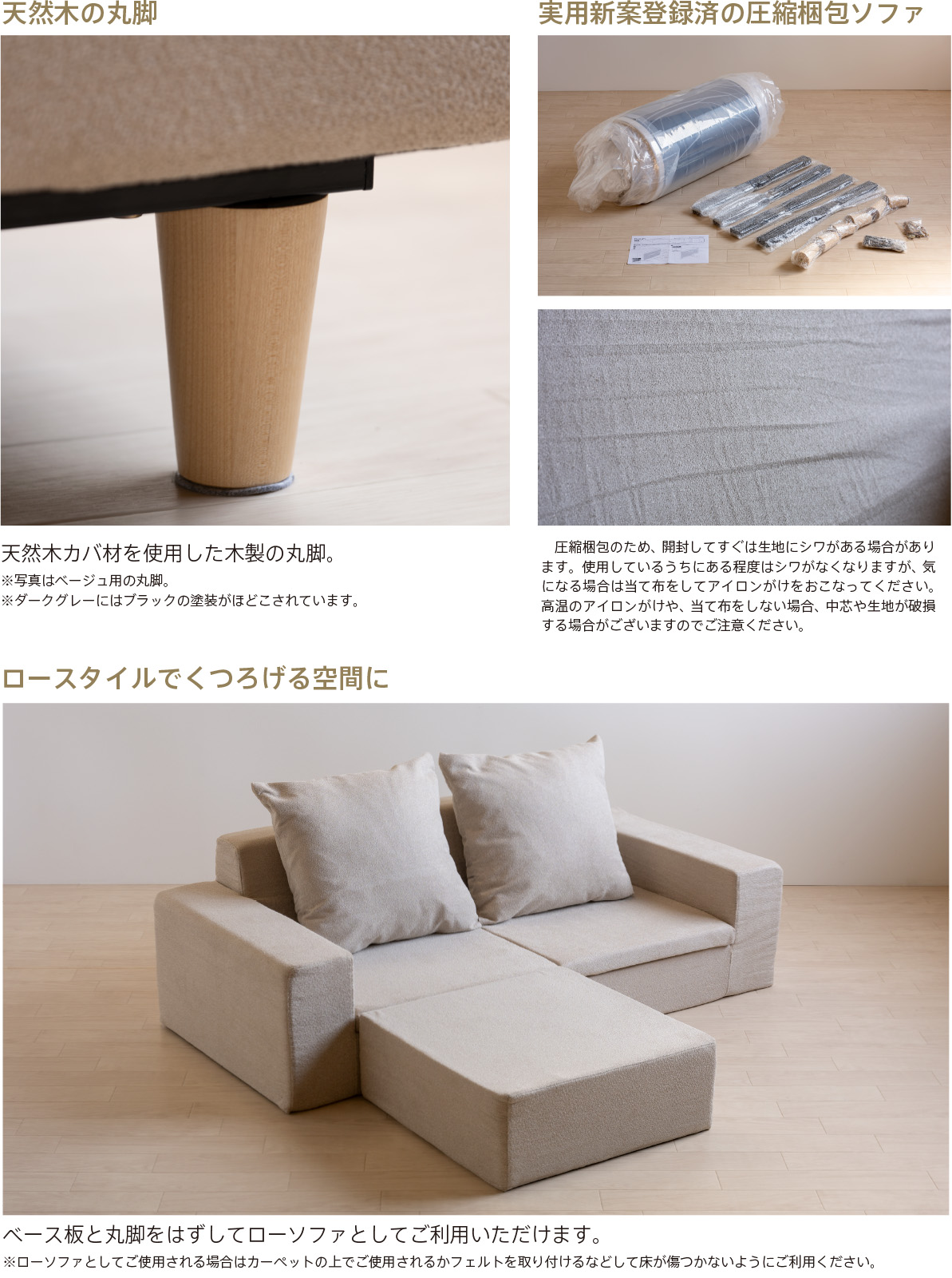 | ・丸脚をはずして、ローソファとして使用可能 (カーペットの上でご使用されるかフェルトを取り付けるなどして床が傷つかないようにご利用ください。) ・圧縮梱包/組立式 ・クッションカバーは丸洗いOKで清潔にお使いいただけます (※本体の外カバーは取り外しできないため、丸洗いはできません。) ・耐荷重:静止状態で180kg ・生産国:中国 ※商品写真に関しましては、実際の色味を出せるようにさせていただいておりますが、お使いのPCの設定などによりまして、色味の方が変わってしまう事がございます。 ※退色や変色の予防などを行い、可能な限り色の管理に努めておりますが、同シリーズの商品であっても、多少の色差が発生してしまう場合があります。 |