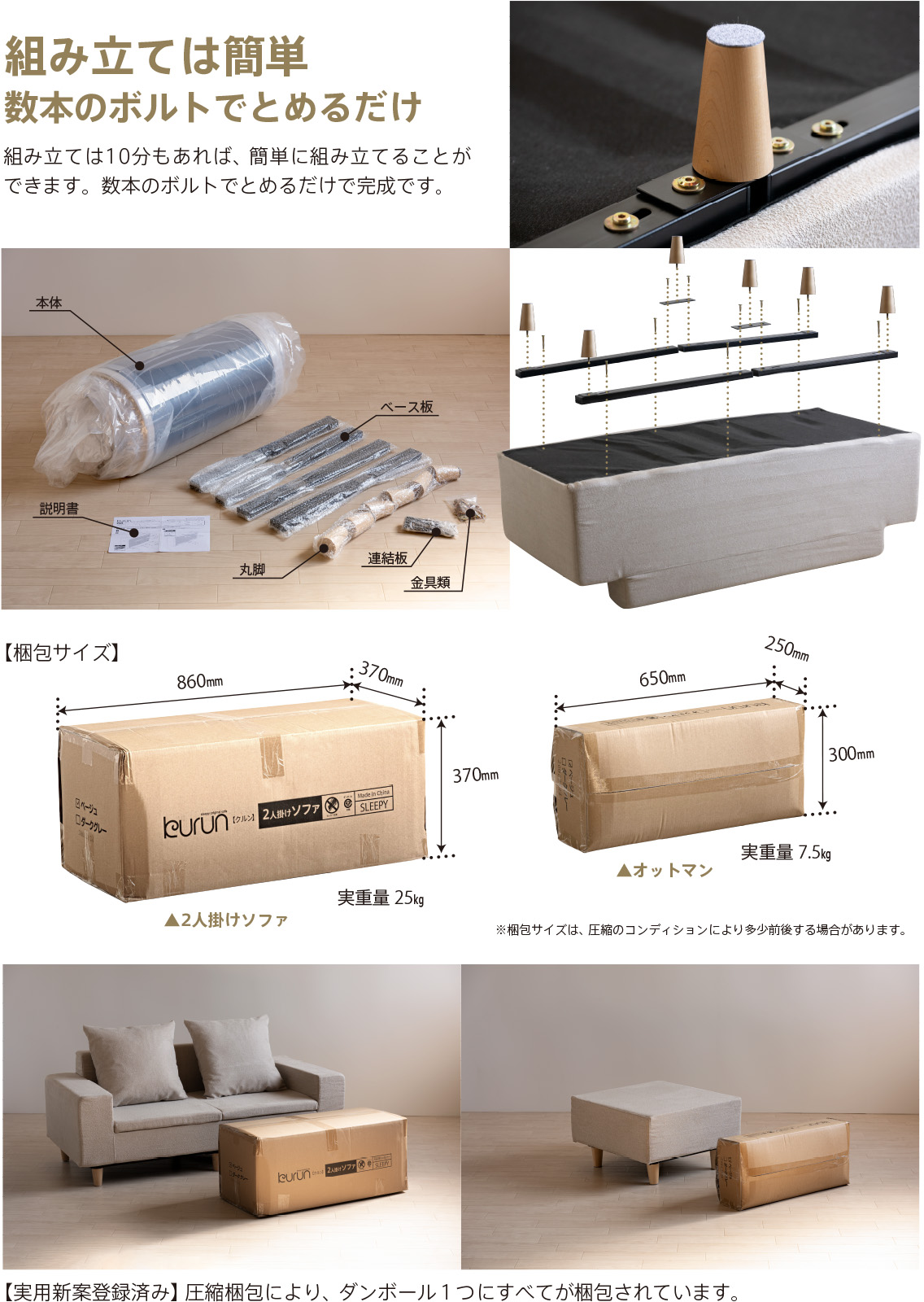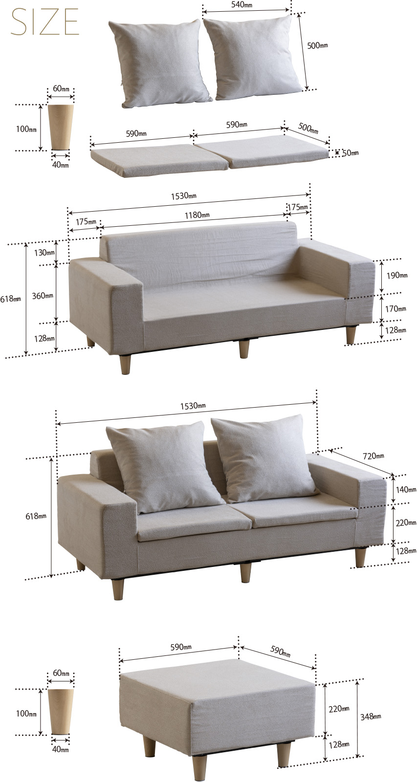| 【2人掛けソファ】 約W1530×D720×H618(SH348)mm ※SH=床から座面までの高さ 重量:約25kg 梱包サイズ:約W860×D370×H370mm 【オットマン】約W590×D590×H348mm 重量:約7.5kg 梱包サイズ:約W250×D650×H300mm |