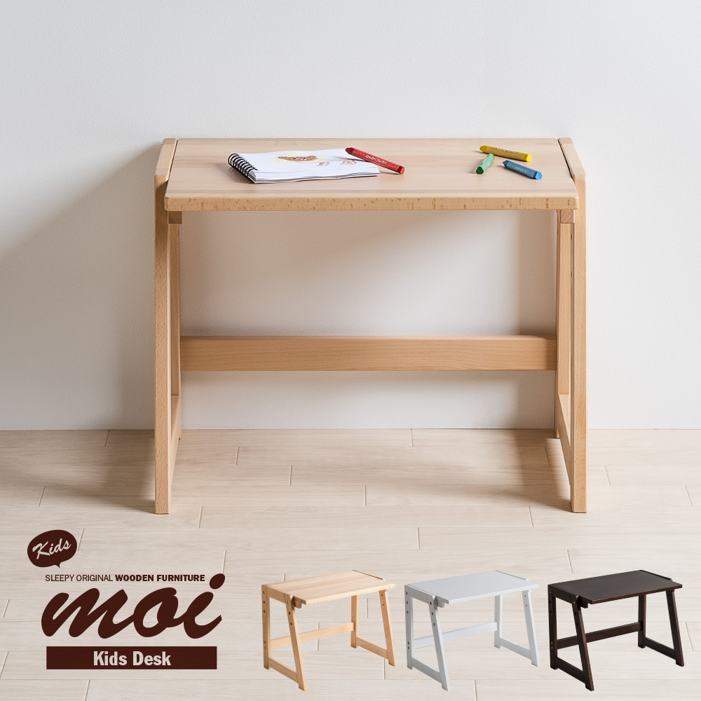 木目の美しい天然木ブナ材(無垢)を使用した木製キッズデスク「モイ」。3段階の高さ調節が可能なキッズデスクです。カラーは、お好みやお部屋の雰囲気に合わせて、ナチュラル(NA)、ホワイト(WH)、ブラウン(BR)の3色からお選びいただけます。 塗料?接着剤などは『ホルムアルデヒド放散等級区分国内最高基準F☆☆☆☆』を取得した材料を使用しています。