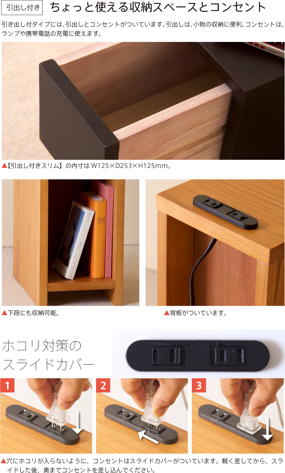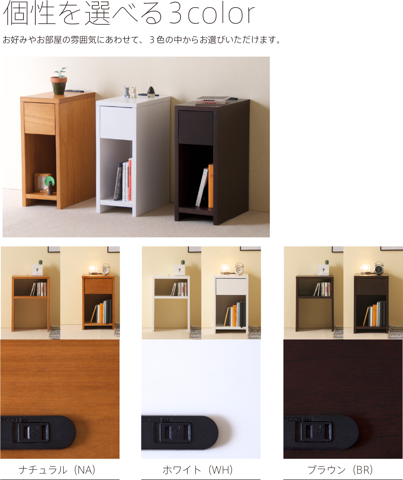 | さりげなくベッドサイドを演出する天然木のスリーピーオリジナルナイトテーブル。化粧合板などは使用していませんので、天然木の味わいをお楽しみいただけます。ナイトテーブルシリーズは、【引出しなしタイプ】と、なにかと便利なコンセントと引出し付タイプ(2サイズ)があります。カラーはナチュラル(NA)、ホワイト(WH)、ブラウン(BR)の3色の中からお選びいただけます。 組立作業は不要で、完成品の状態でお届けいたします。 ・生産国:中国 ・完成品 |