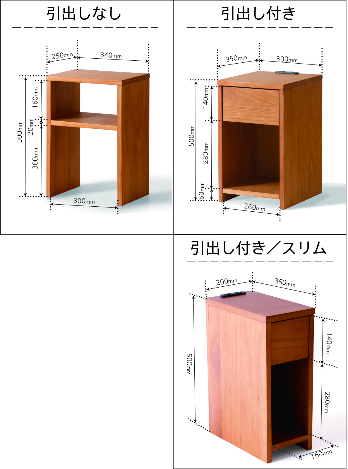 【引出しなし】W340×D250×H500mm(重量:約2kg) 【引出し付き】W300×D350×H500mm(重量:約4kg) 【引出し付き・スリム】W200×D350×H500mm(重量:約3.5kg)