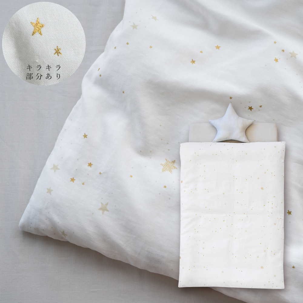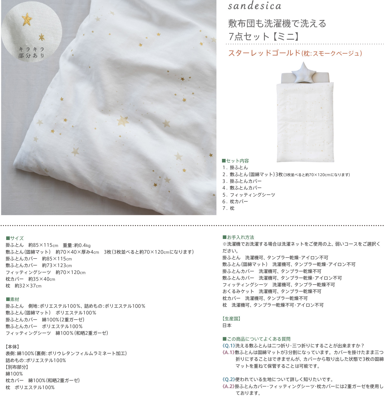 sandesica(サンデシカ)「敷布団も洗濯機で洗える 7点セット スターレットゴールド/枕:スモークベージュ・レギュラーサイズ」 ベビー布団 日本製