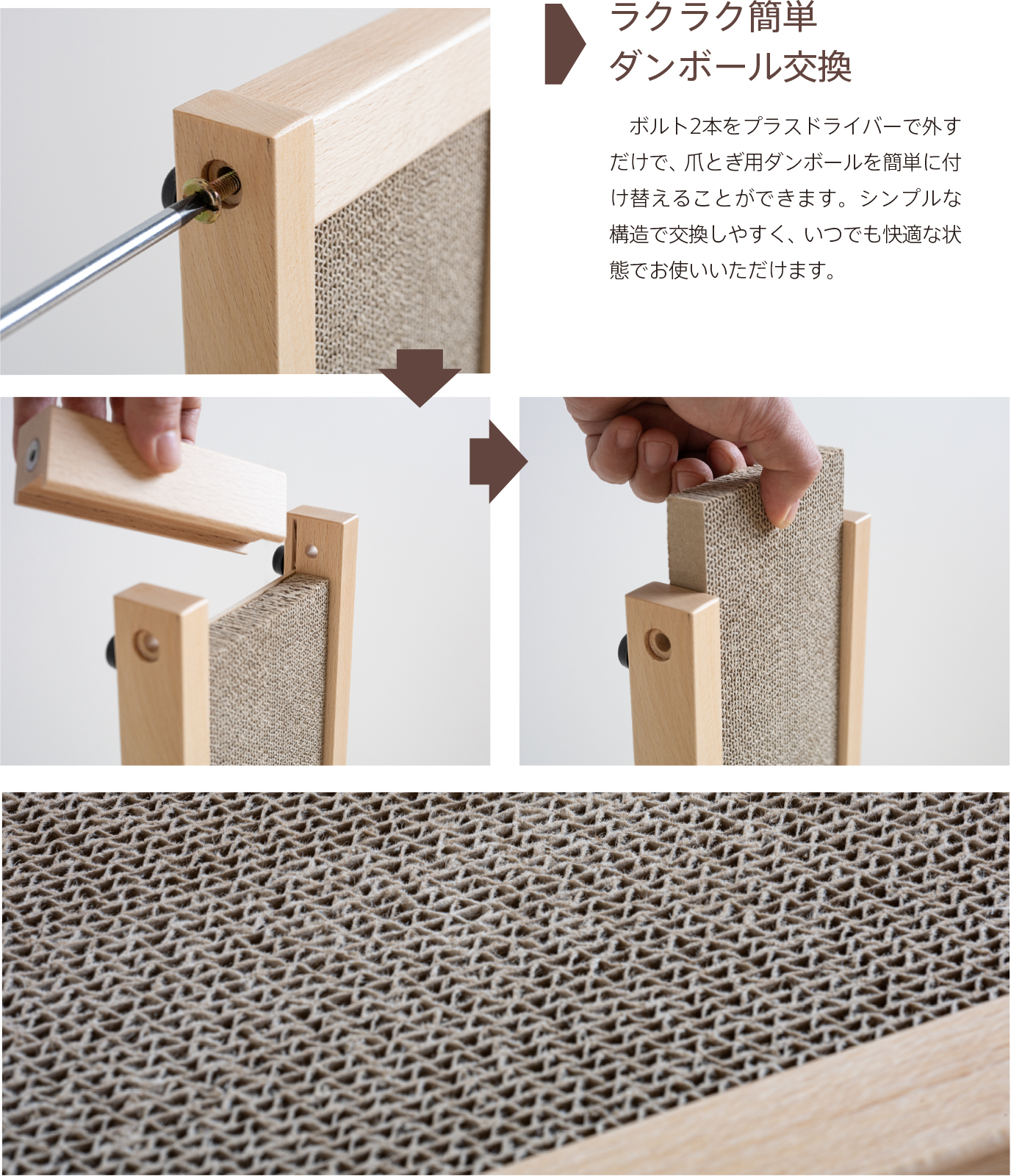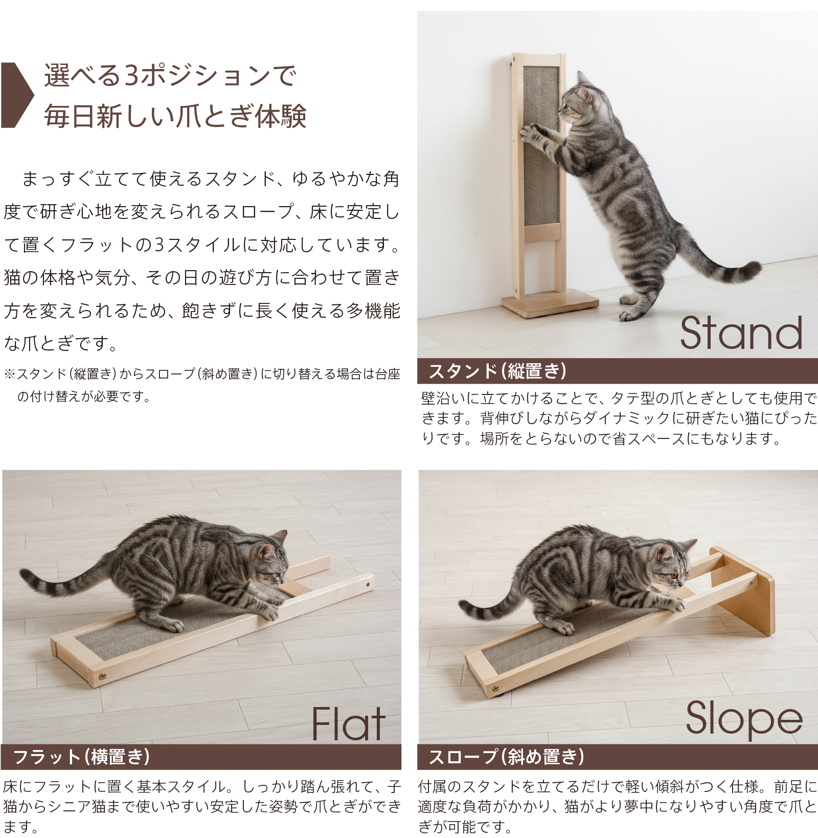 猫のため 暮らしのためにつくった「爪とぎスタンド」 上質な天然木ブナ材で丁寧に仕上げた、インテリアになじむ猫用爪とぎスタンド。爪とぎ部分には 古紙を利用した目の細かい高品質ダンボール を採用し、磨きくずが少なく長持ち。猫にも人にもやさしいこだわりが詰まった日本製モデルです。フレームに使用している塗料や接着剤は、スリーピーのベビーベッドと同じ基準の安全性の高いもの。毎日触れるものだからこそ、安心して使える品質にこだわりました。本体は 縦・横・斜めの3パターンで設置可能。猫の好みやスペースに合わせてレイアウトを変えられ、運動不足解消やストレス発散にも効果的です。さらに、使い終わったら差し替えるだけの専用交換用ダンボール(別売) もご用意。清潔に長くお使いいただけます。安全性・デザイン性・機能性のすべてを備えた日本製・木製フレームの爪とぎスタンドです。
