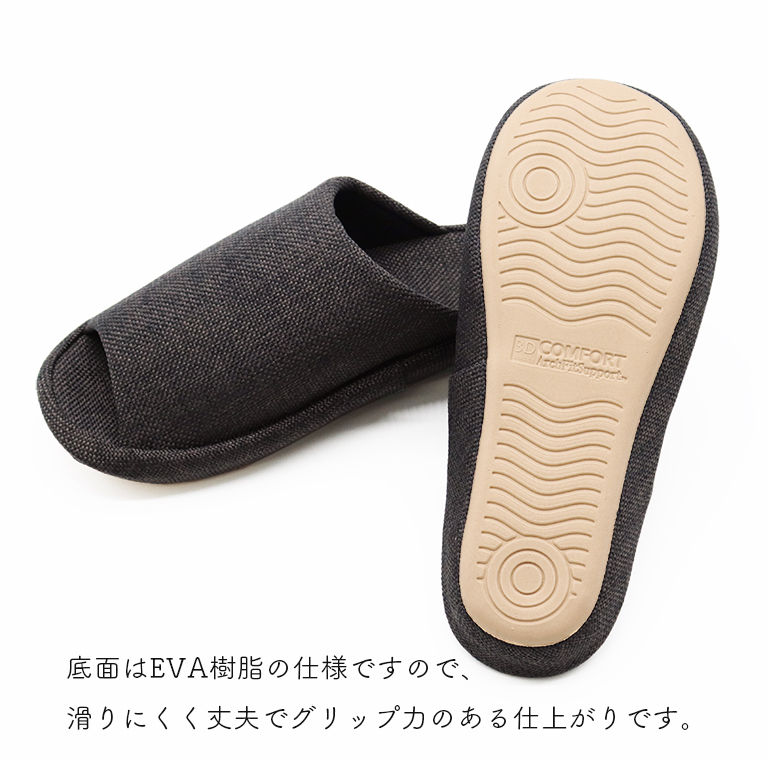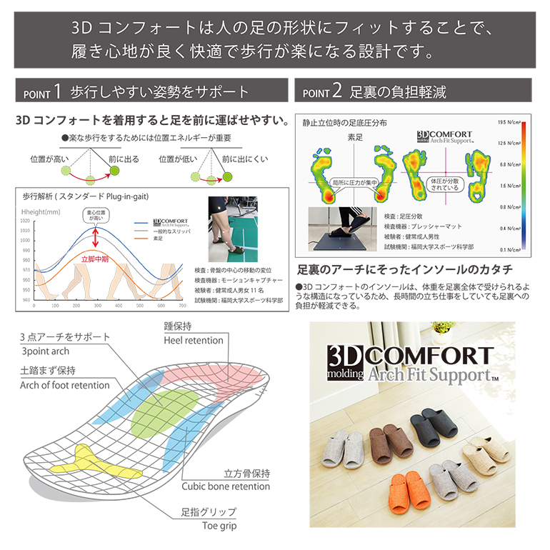 中敷部分には足裏のアーチに沿った3次元形状の設計により、足に優しく快適な室内履きとして開発しました。