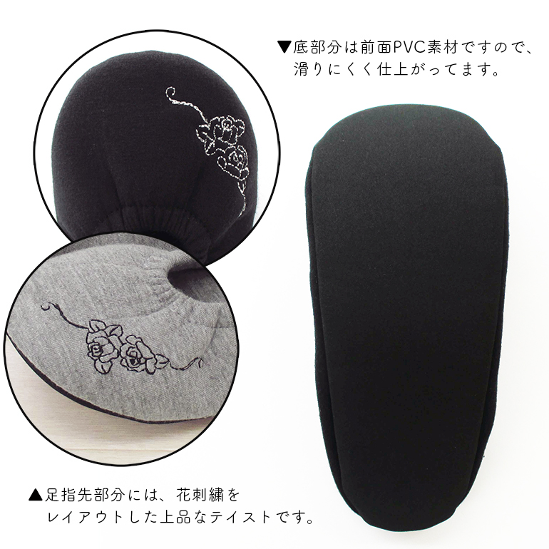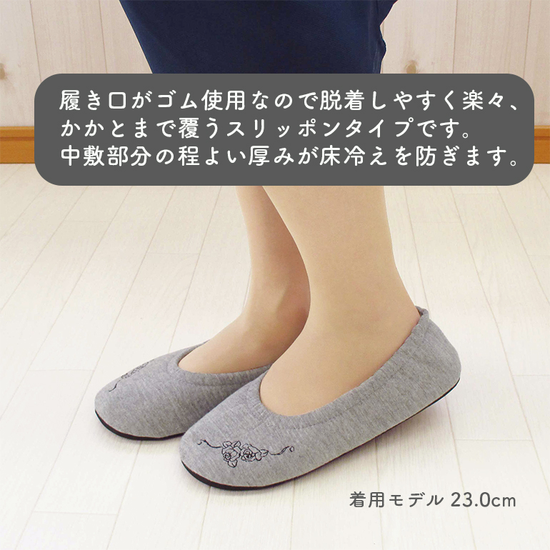 かかとまで覆うスリッポンタイプで、中敷部分も程よい厚みで床冷えも防ぎます。