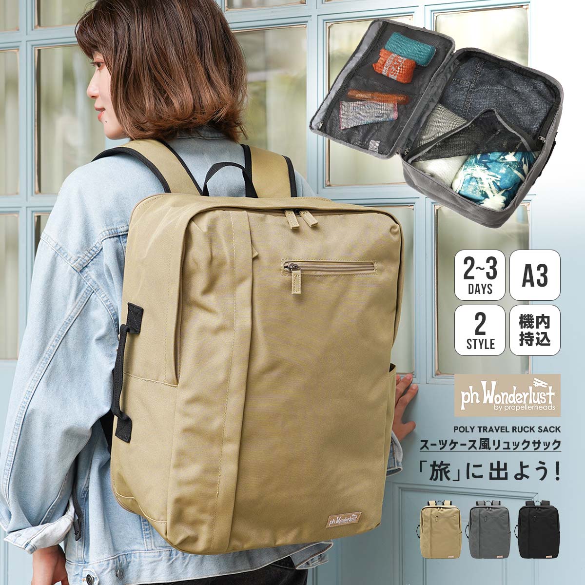 | 修学旅行・出張・部活遠征・週末旅行に! スーツケースのように大きく開くスクエア型リュックサック。A3サイズ対応の大容量で、Tシャツなら約18枚収納可能!夏なら3泊、冬なら2泊程度の荷物が入ります。 スーツケース風開閉でパッキングが快適。 背面ファスナーをぐるりと開けると大きくフルオープン!さらに、メイン収納部へはメッシュの仕切り付きで開閉時に中身があふれるのを防ぎます。もちろん正面からもメイン収納へアクセス可能。ちょっとした荷物の出し入れも快適。 ハンドル付きの2STYLE仕様。 本体はハンドスタイルの横持ちでも使えます。背面ポケットにショルダーを収納できるので取り扱いが楽!電車や飛行機の上部収納に置く時などもスマートに扱えます。 型崩れしにくく軽量で使い勝手抜群。 重さわずか655gのポリエステル製で、ぐるりと囲むように内側の側面に柔らかな芯材入り。荷物を入れても型崩れしにくくなっています。ショルダーには調節可能なチェストベルトとDカン付き。荷物が左右に揺れにくく安定をサポート。Dカンには小物やカラビナを取り付け可能。使いやすくアレンジできます。 修学旅行・部活遠征にも最適。 スクエアフォルムなのでユニフォーム・着替え・タオル・洗面道具などの整理も簡単!正面のA4対応ポケットはクリアファイルが入るサイズ感。資料や書類にパンフレット、タブレットケースやガイドブックなどの収納に最適。試合・合宿・研修・校外学習にも対応する万能設計です。 整理しやすい多収納構造 ・外側にA4、A6対応のファスナーポケットが1つずつ ・ペットボトルや折りたたみ傘用の外側サイドポケット×1 ・内側のA6対応ファスナーポケット×1 ・内側のA5対応仕切り付きのメッシュファスナーポケット×2 サラッとした手触りでしっかりとしたポリエステル生地を使用。どなたにも使いやすく合わせやすいカラー展開で、学生から社会人まで幅広く使えるシンプルなデザイン。 旅行・出張・推し活バッグとして、お子様の修学旅行バッグや部活の遠征バッグとしてなど、様々なシーンで活躍するリュックサック。 【旅に出よう!】プロペラヘッズ新シリーズ「ph wonderlust」。 トラベルをテーマにした、旅に便利なバッグ・小物シリーズから登場です。 |