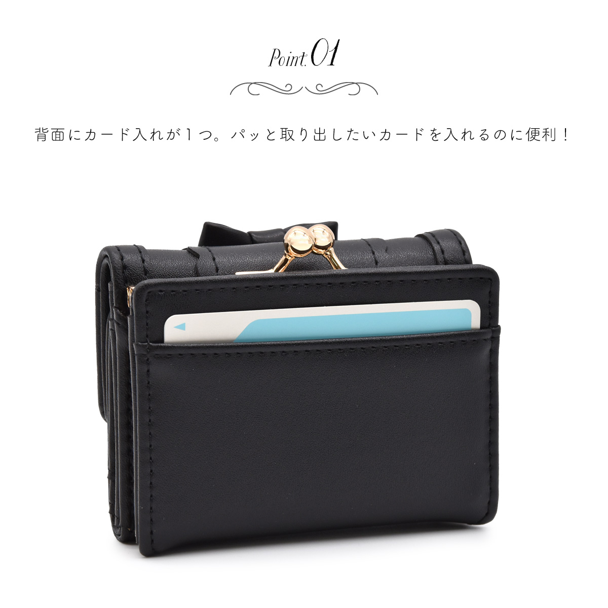 | 〜 可愛いものが大好きなみんなに使ってほしい、可愛い魔法をあなたに 〜 ぷっくりとしたリボンやビジューが、ガーリーでキラキラ感溢れるお財布。 3つ折りタイプなのでミニバッグにもスッポリ収まるコンパクトサイズ。持つだけでココロときめく可愛らしいデザインが魅力です。プレゼントにもオススメ! 内側にカード入れが4つ、お札入れが1つ付いたシンプルな仕様。背面にカード入れが1つ。パッと取り出したいカードを入れるのに便利です。 がま口開閉の小銭入れはがばっと開くトレー型。中身が見やすく取り出しやすくなっています。 |
