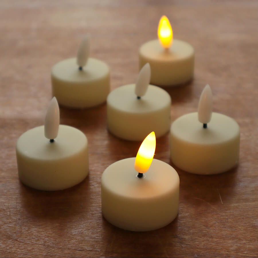 まるで本物のキャンドルのように、やさしく揺らめくティーライト型のLEDライト。