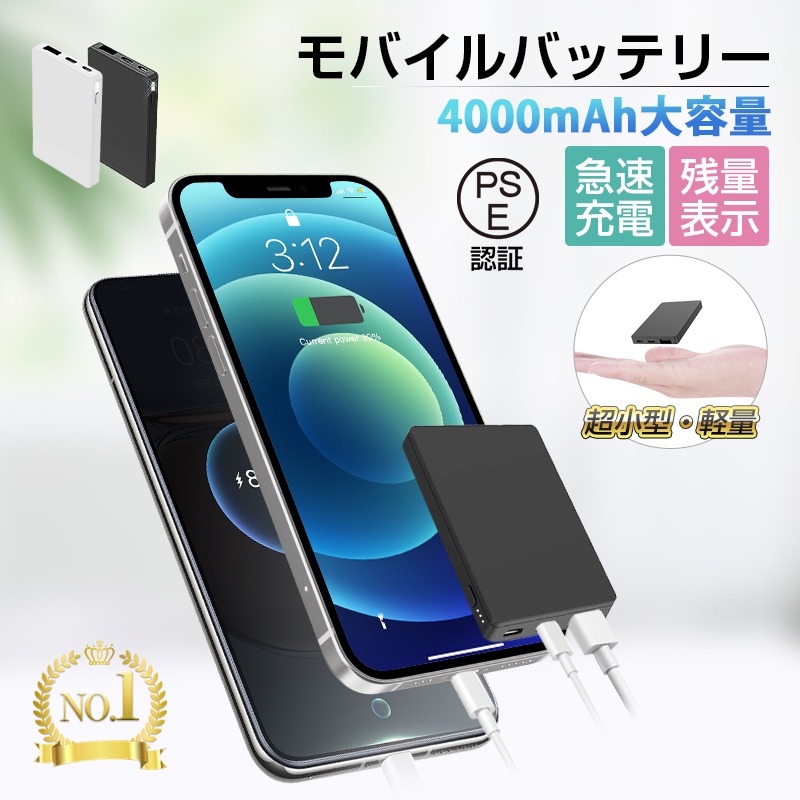超小型 超薄型 モバイルバッテリー 大容量 4000mAh コンパクト iPhone17 防災電源 軽量 入力2ポート 急速充電 ミニ 楽々収納【PL保険加入済み製品・安心】