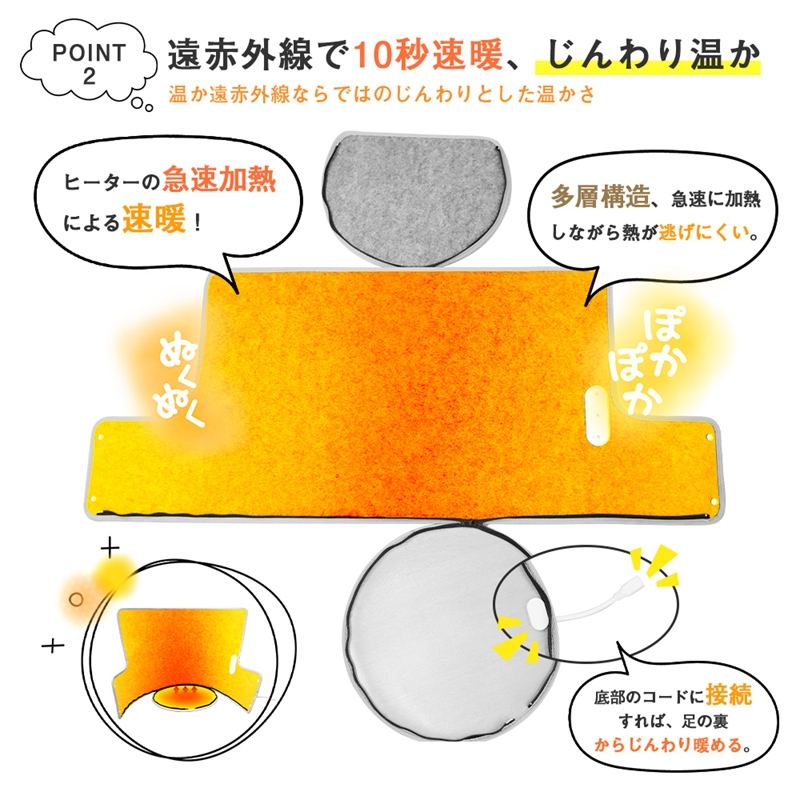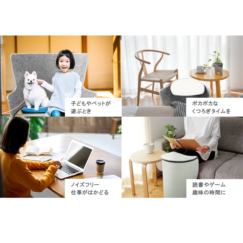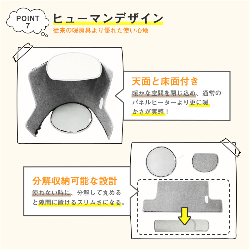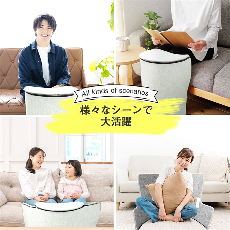 天面以外の床面と全方面が発熱板になっており、使いたい場所で設置すれば膝下をぐるりと囲んでじんわり温めます。床面も発熱するので足の裏も指先も暖かくて全然暖かさが違います。天面のパネルは外す・背面に倒すこともできるので、キッチンの立ち仕事や座卓で背中を温めたりもできて、マルチに活躍します。※天面は発熱しません、ご了承ください。