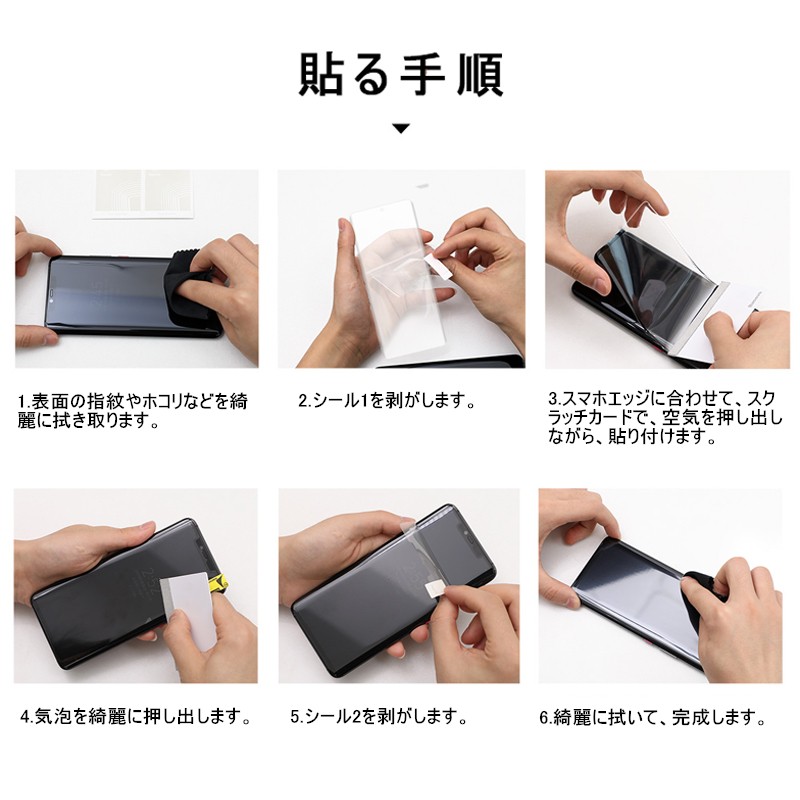 3.スマホエッジに合わせて、スクラッチカードで、空気を押し出しながら、貼り付けます。