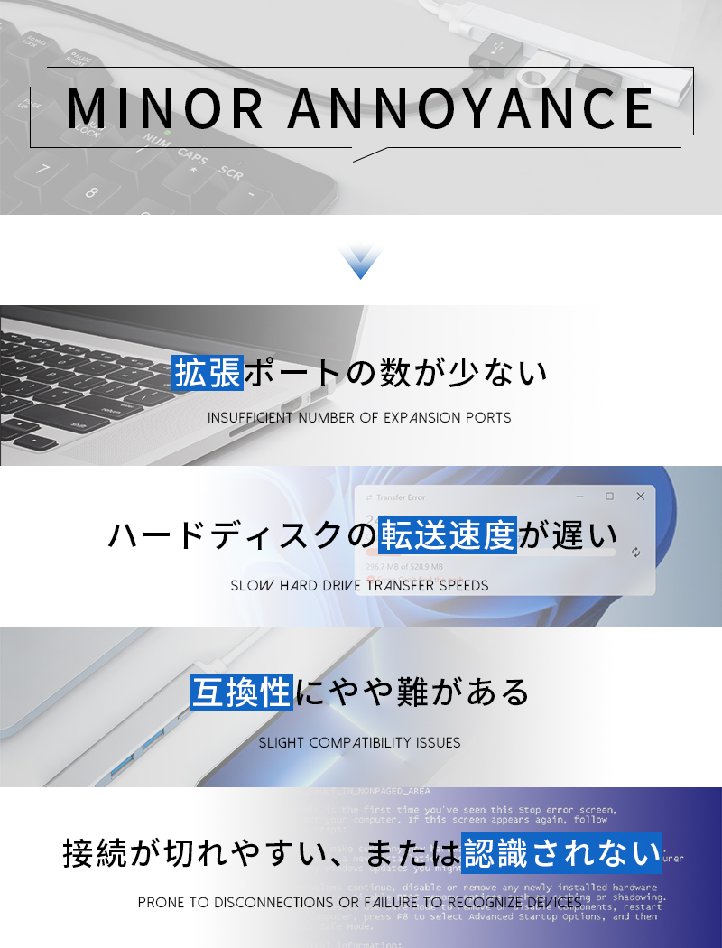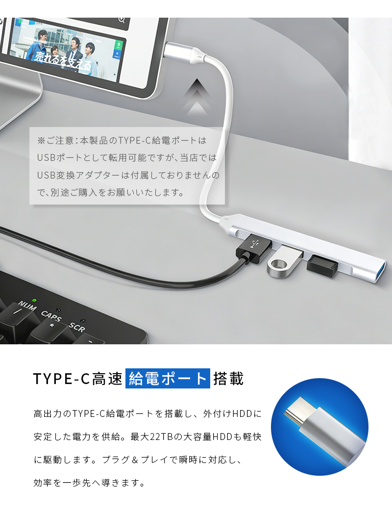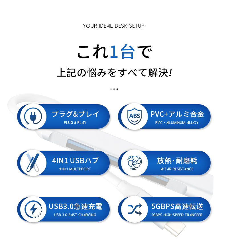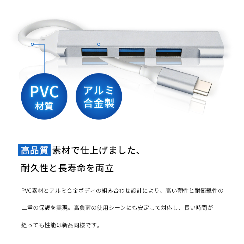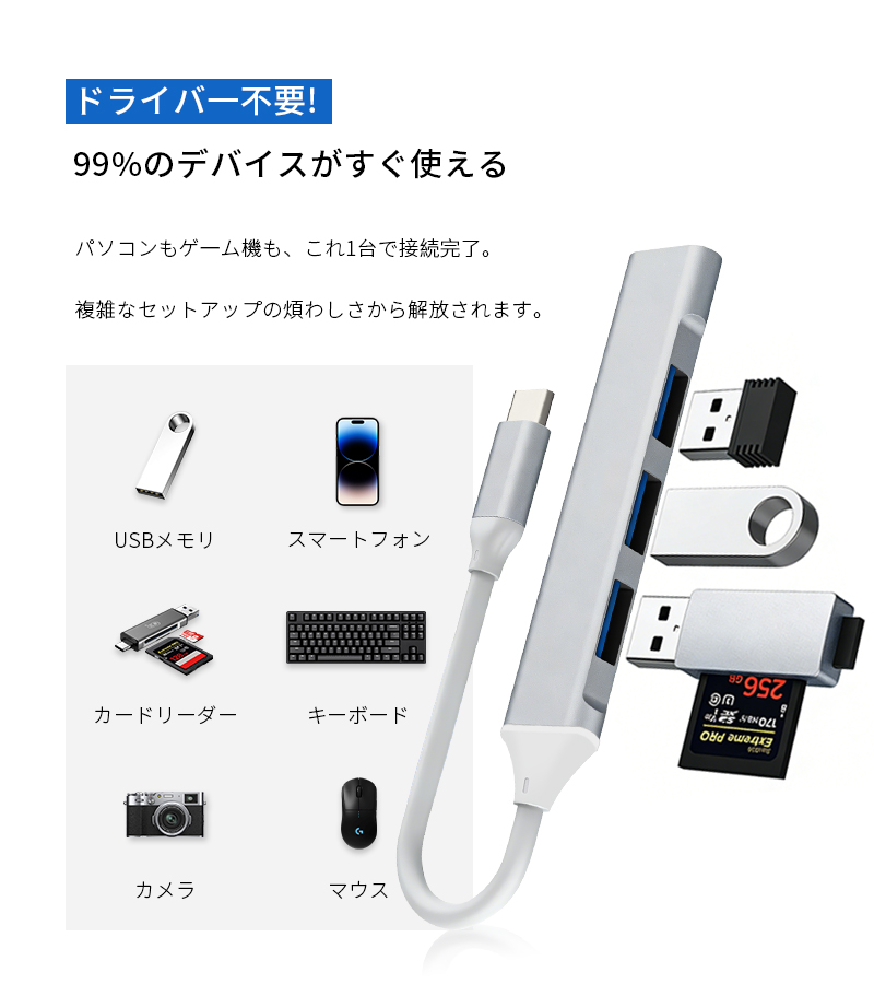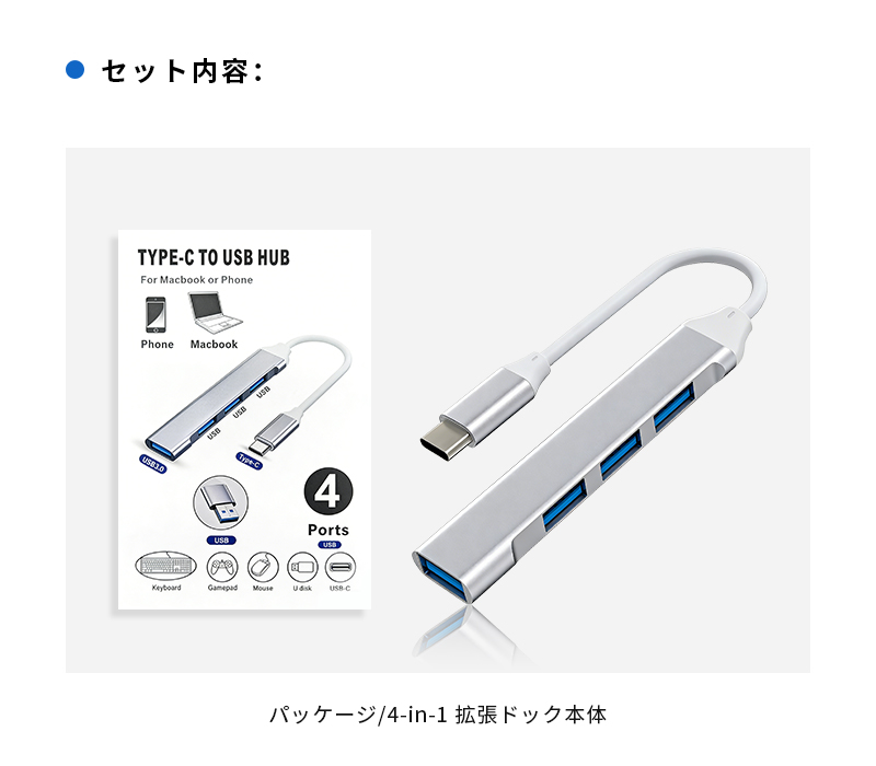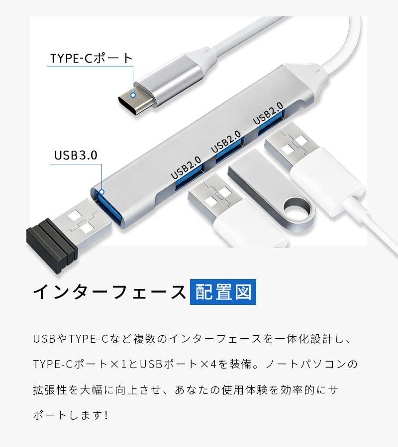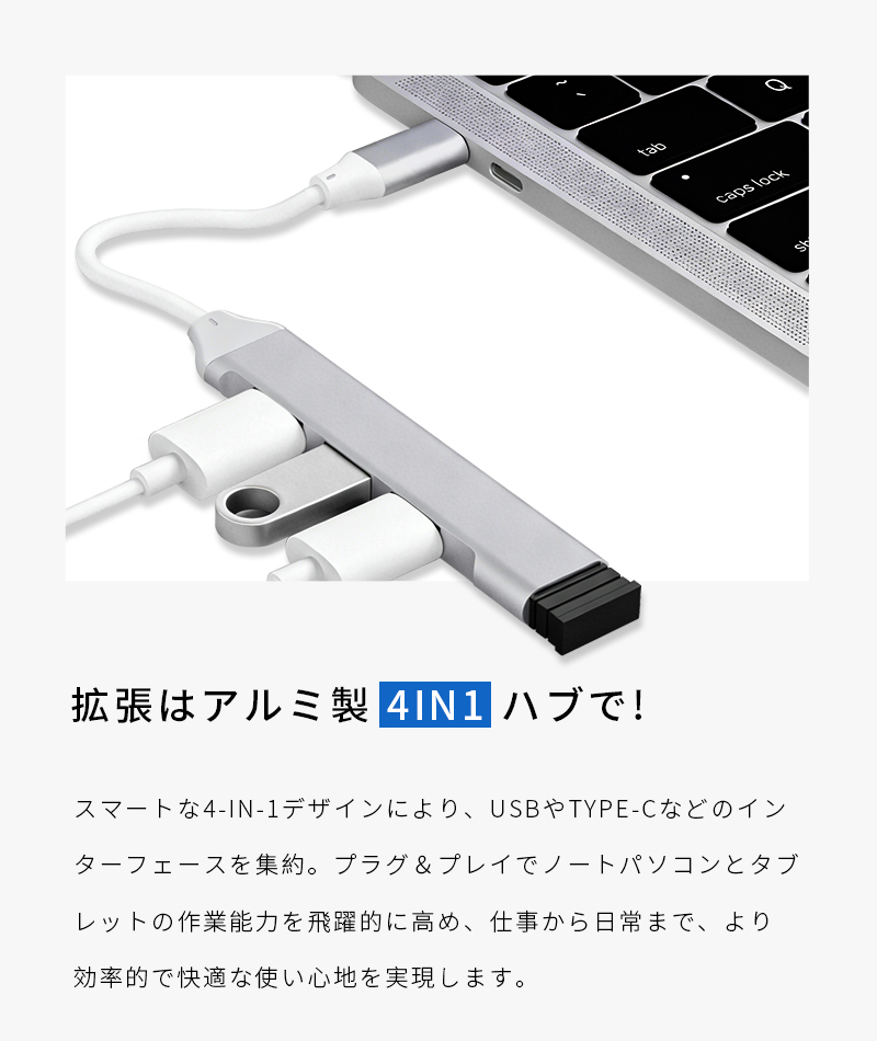 1.本製品は、Type-Cを搭載したMacBookやスマートフォンなどの最新デバイス向けに設計された4-in-1 USB拡張ハブです。わずか83×16×7.5mmの小型ボディに、合計4つのUSB-Aポートを集約。