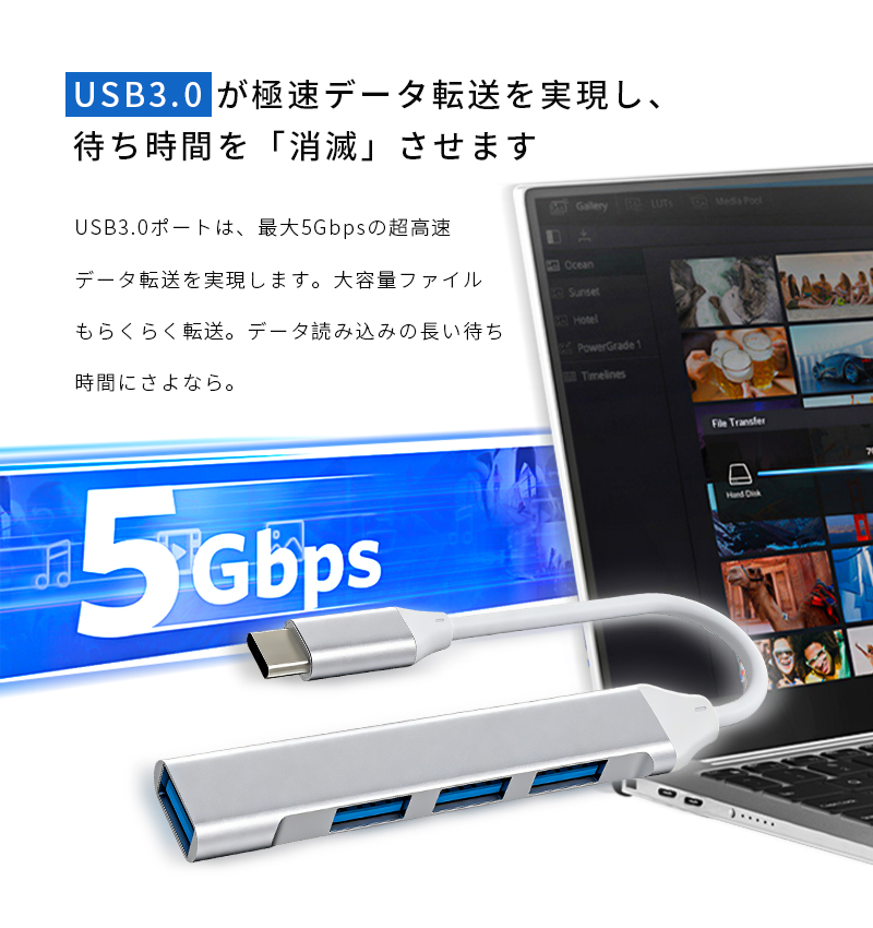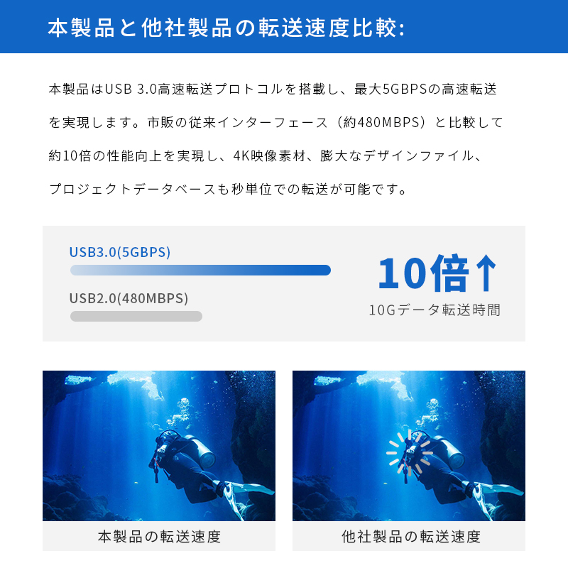 2.一つポートのUSB 3.0(5Gbps対応)を内蔵しており、大容量ファイルの転送を高速で行えます。