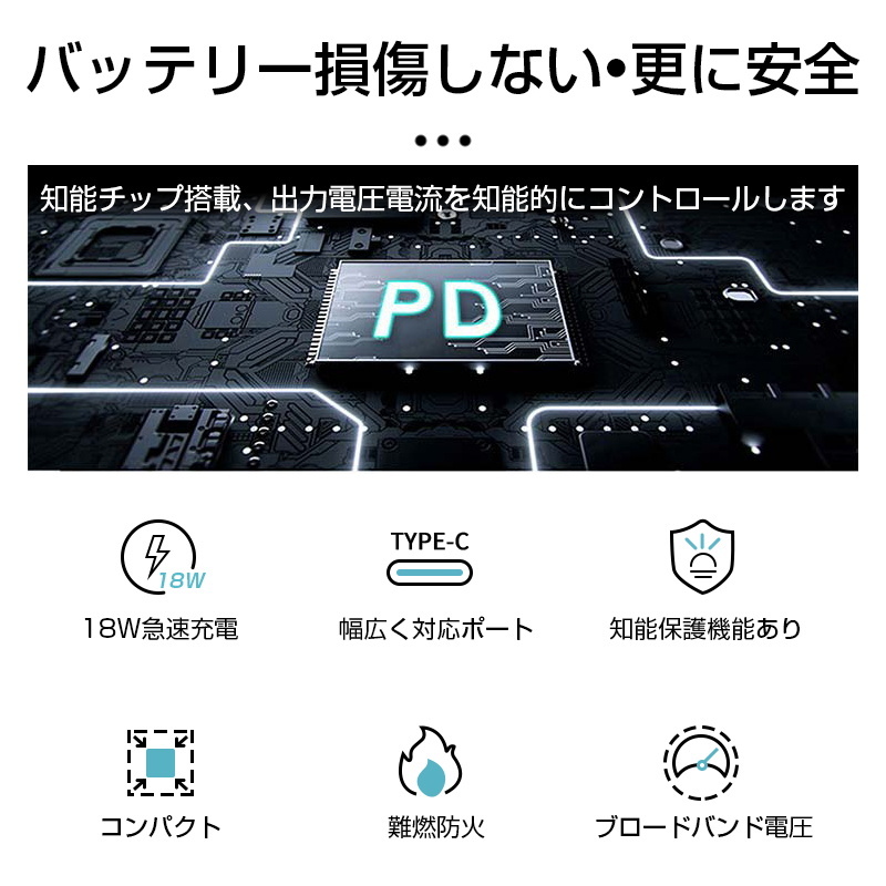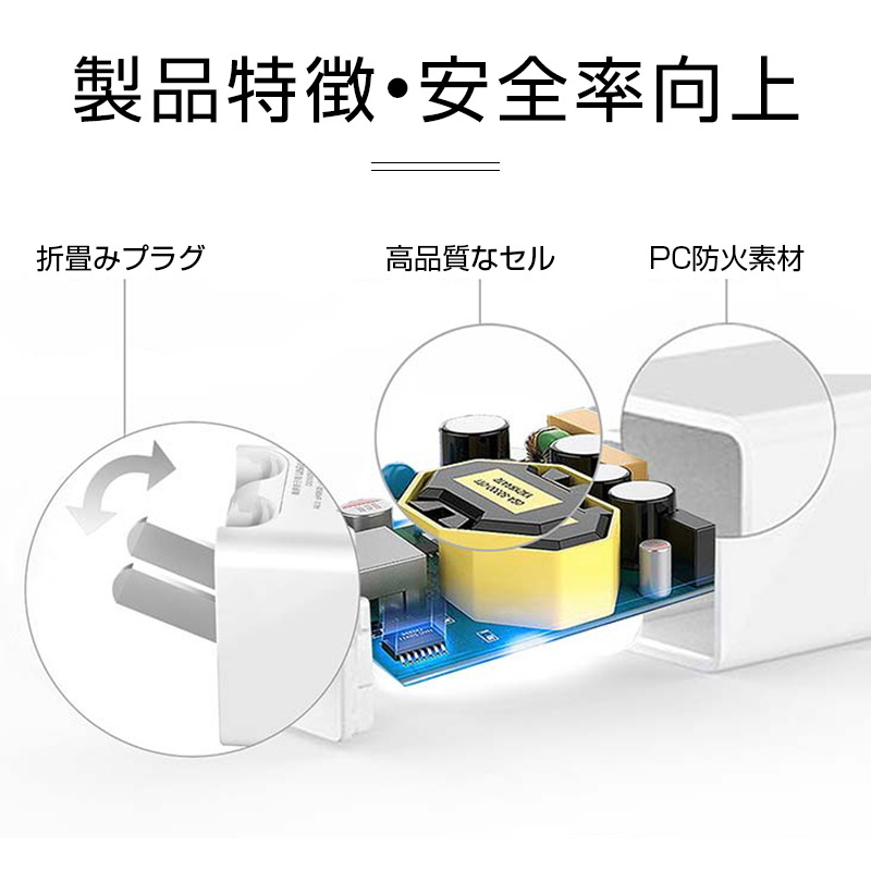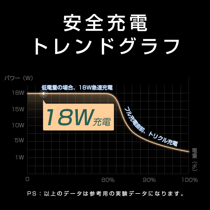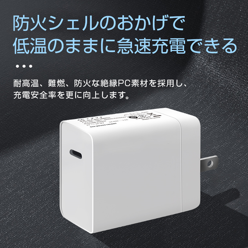 【低温充電】内部には高品質なトランスを採用しており、温度を厳密に制御出来ます。外部は耐高温、難燃、防火な絶縁PC素材で防火シェルを作り、発火現象を防止します。故に本製品は低温のままでもスピード充電ができ、安心・安全・効率良く充電できます。