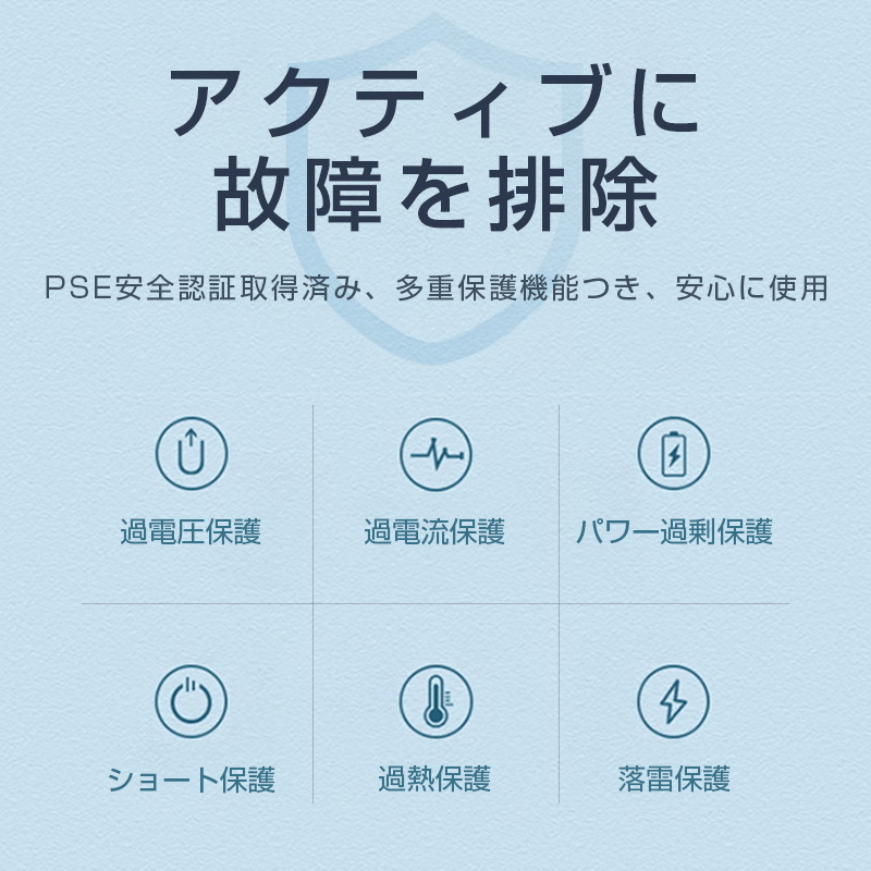 【優れた安全性】PSE安全認証取得済み、多重保護機能付きで、安心に使用できます。過電圧保護、過電流保護、パワー過剰保護、ショート保護、過熱保護、落雷保護等の保護機能が多く揃えて、アクティブに故障を排除でき、安全性を確保し、より安心に使用できます。