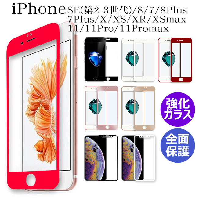 保護フィルム iPhone11 Pro Max iPhoneXR iPhoneX iPhoneXS MAX iPhone8 iPhone7 Plus フルラウンド ガラスフィルム 全面保護 液晶保護 曲面保護 赤 黒 白 桃