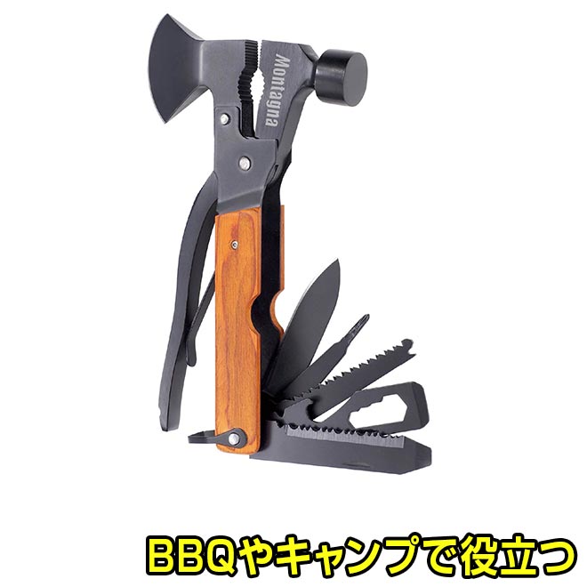 ““斧・ペンチ・ニッパー・ハンマー・ナイフ・プラスドライバー・ノコギリ(細/荒)・マイナスドライバー(大/小)・六角レンチ・栓抜き・ヤスリ”を備えた13WAYマルチツールでBBQやキャンプシーン、災害時、バトニング時などに活躍します。