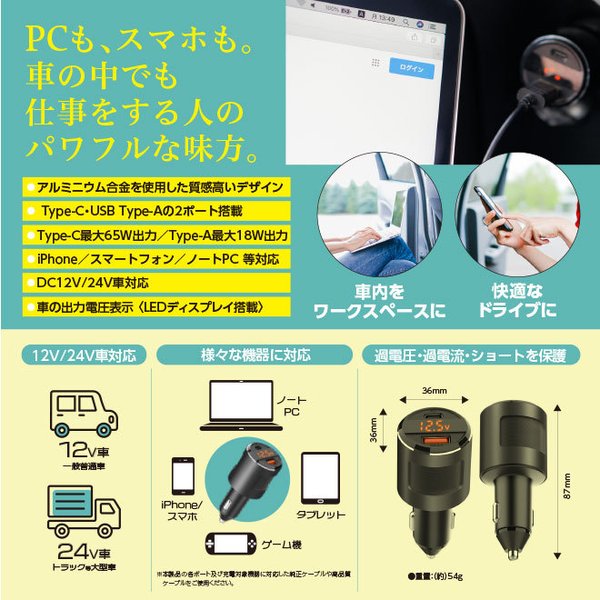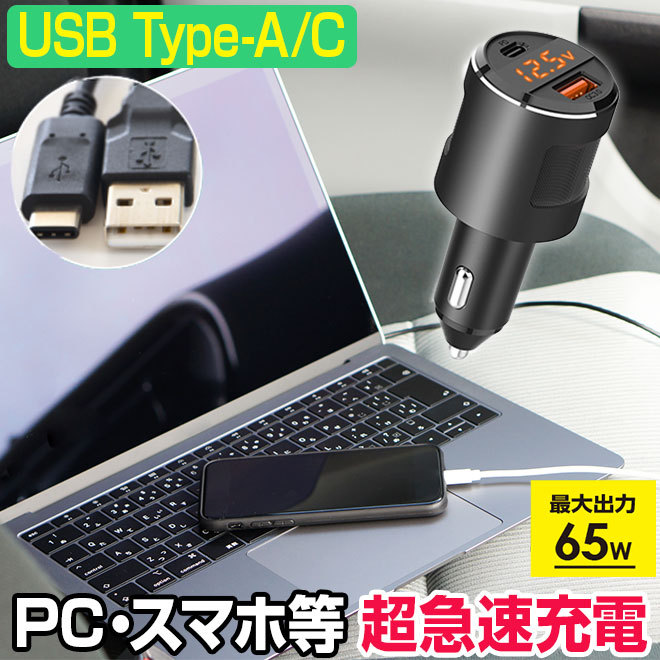 カーチャージャー シガーソケット 65W 超急速充電 USB 2ポート Type-C Type-A 12V 24V カー用品 カーアクセサリー 充電器 PC スマホ ゲーム 車 スマホ充電 パソコン タブレット 車内 車中泊 送料無料