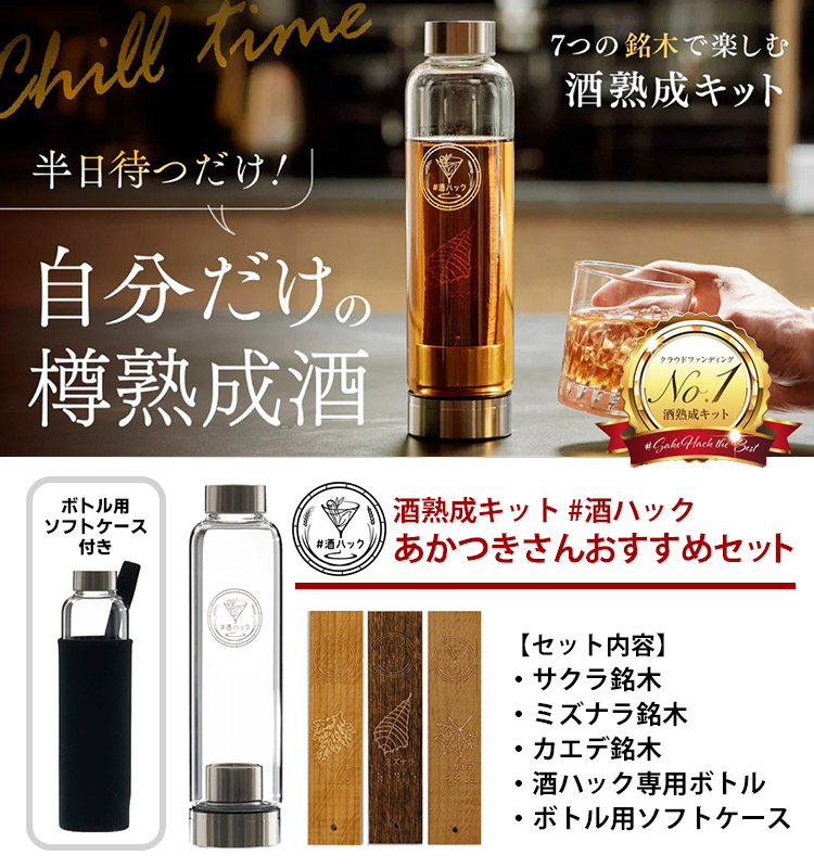 | 「あの、まろやかで芳醇な樽熟成酒を、もっと気軽に飲みたい!」 #酒ハック お酒好きの夢を叶える "半日熟成" キットからあかつきさんおすすめ銘木、サクラ・ミズナラ・カエデの3種類をセットに加えたあかつきさんおすすめセットの登場です。 ご自宅で飲むいつものお酒。もっと美味しく、もっと特別なものにしたい。 そんなお酒愛好家の夢を叶える、熟成キットです。 銘木を付属の専用ガラスボトルにセットし、お酒を注げば、なんと半日待つだけで、まるで樽で寝かせたような、奥深い味わいと豊かな香りに! お酒好きが開発した、お酒好きなあなたのためのキットです。 |