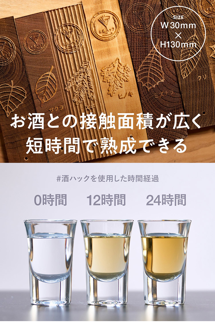 | 取り出した銘木を、違うお酒に漬けるのもおすすめ。 ワインの後に日本酒に入れたり、ウィスキーの後に焼酎に漬けたりすれば、木の香りだけでなく、他のお酒の風味が溶け出して、ユニークな味わいが生まれます。 さらに、いろいろなお酒の成分を吸い込むと、銘木も育っていきます。 使えば使うほど世界に一つの銘木になり、世界に一つのお酒へと進化。 一度乾燥させた銘木を自分で焼き直すのもおすすめ。自分好みの焼き加減で、香りを理想に近づけられます。 酒ハックの銘木は3〜4回の使用が可能です。(組み合わせるお酒や熟成期間により変わります。) 組み合わせるお酒は、ウイスキーや焼酎、ラムなどに対応。 比較的低価格なお酒の方が変化を実感しやすくオススメです。 酒税法を守ってアルコール度数20%以上のお酒をご使用くださいませ。 |