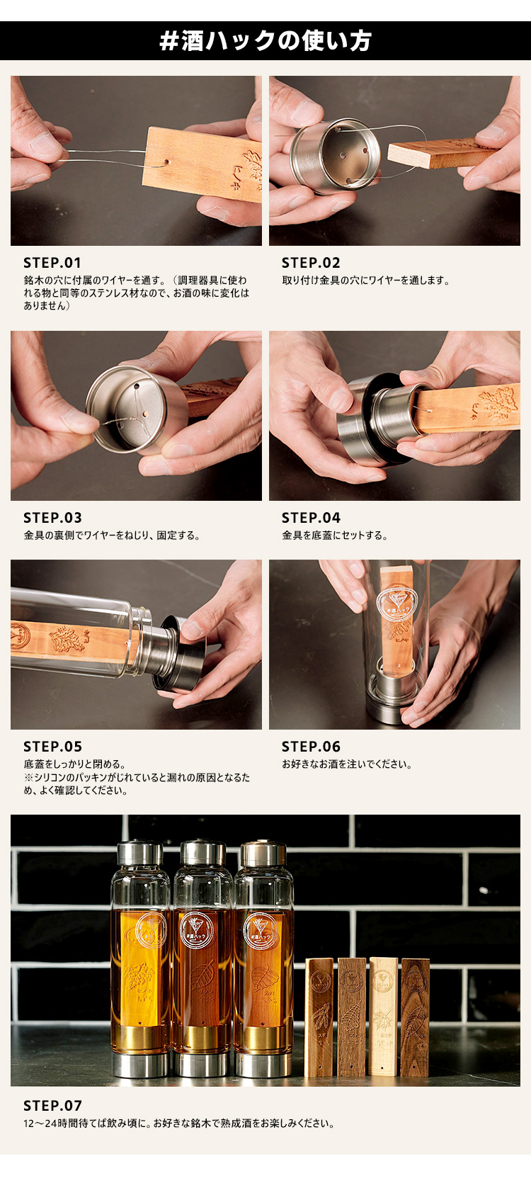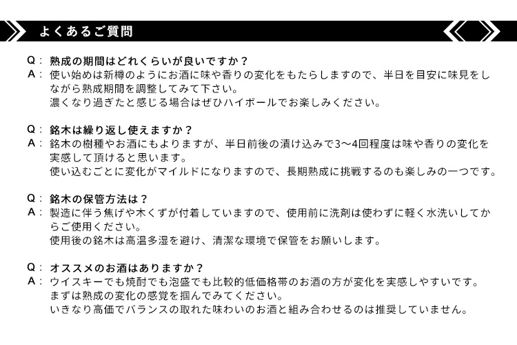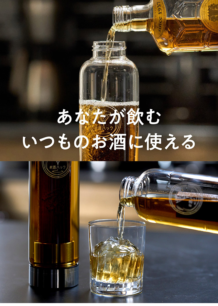 | #酒ハックはウィスキーやスピリッツなど、あなたがいつも楽しんでいるお酒にそのまま使用できるため、特別な用意は一切不要で、届いたその日から熟成樽酒を楽しむことができます。 |