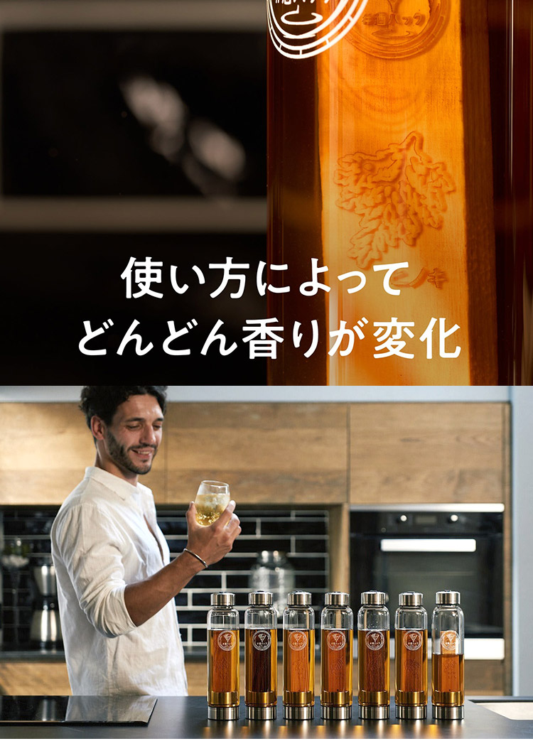 | 専用ボトルを使えば、より気軽に#酒ハックを楽しむことができます。 焼き上げ(チャー)した国産銘木をボトルにセットし、いつものお酒をそのまま注いだら準備はOK。 わずか半日で、憧れの樽熟成酒が楽しめます! 専用の木目調ボックスに入れてお届けするので、特別な日のおもてなしや、自分へのご褒美、お酒好きの大切な方へのサプライズギフトにも最適です。 |