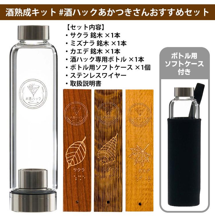 | セット内容 | ・酒ハック専用ボトル ×1本 ・ボトル用ソフトケース ×1個 ・サクラ 銘木 ×1本 ・ミズナラ 銘木 ×1本 ・カエデ 銘木 ×1本 ・ステンレスワイヤー ・取扱説明書 |