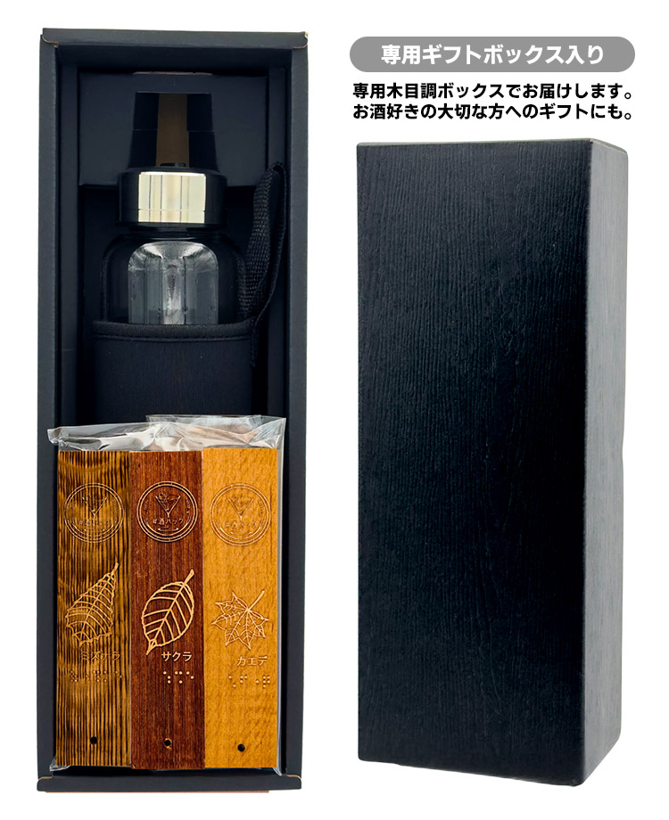 | 【正規販売店】半日待つだけ。いつもの一杯をカスタマイズする酒熟成キット「#酒ハック」あかつきさんコラボ記念おすすめセット(サクラ・ミズナラ・カエデ&専用ボトル) |