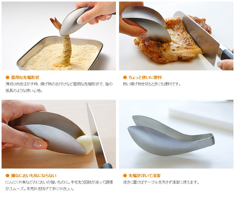 | 最近はネイルアートなど、指先のお洒落を楽し・゛女性が増えています。せっかくのネイルを汚したくない、傷めたくない女性の声に応える新しいタイプの調理用トングが出来ました。 あなたの指のかわりにつかみます 独自の加工でやわらかなバネ性を持たせているので、自分の指のような感覚で自然に使えます。 ● 器用な先端形状 薄切り肉をはがす時、揚げ物の衣付けなど器用な先端形状で、指の延長のような使い心地。 ● ちょっと使いに便利 熱い揚げ物を切るときにも便利です。 ● 嫌なにおいも気にならない にんにくや魚などのにおいの強いものに。手を洗う回数が減って調理がスムーズ。手荒れを防げて手にやさしい。 ● 先端が浮いて清潔 逆さに置けばテーブルを汚さず清潔に使えます。 |