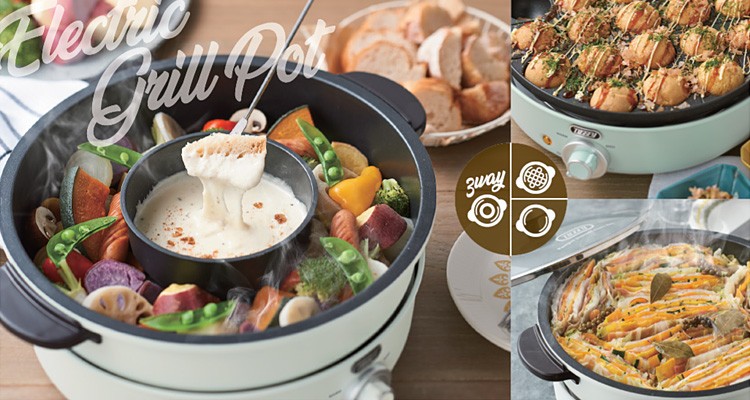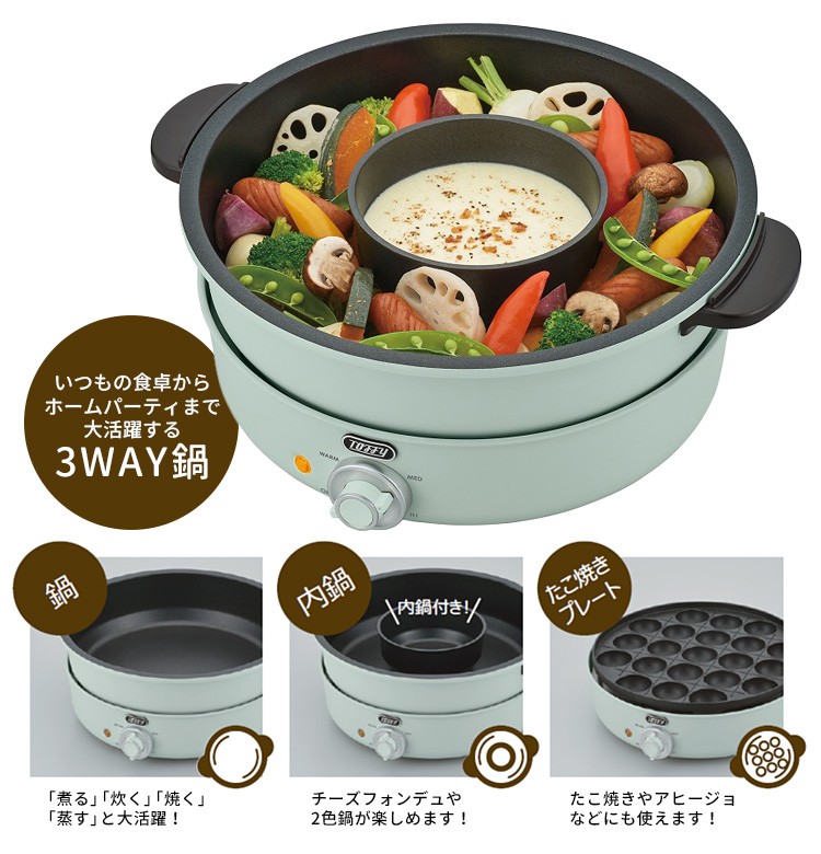 | 小さい内鍋やタコ焼きプレートで様々な料理が楽しめる3WAY電気鍋 2色鍋やチーズフォンデュ、アヒージョなどが楽しめるのでホームパーティーなどでも大活躍! |