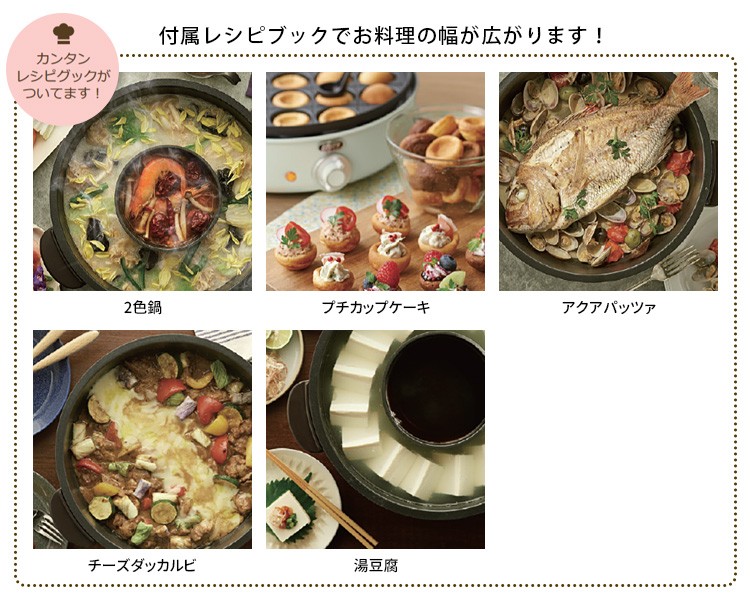 | 付属品 | 鍋、内鍋、たこ焼きプレート、ガラス蓋、レシピブック、電源コード、ユーザーズガイド(保証書含む) |