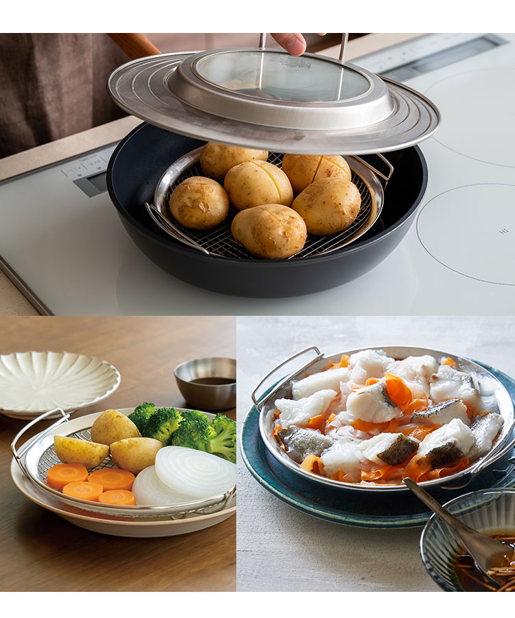 | いつものフライパンで手早く蒸せる! 水を張ったフライパンの蒸しカゴを置いて食材をセット。フタをして火をかけるだけで簡単に蒸し料理ができます。 |