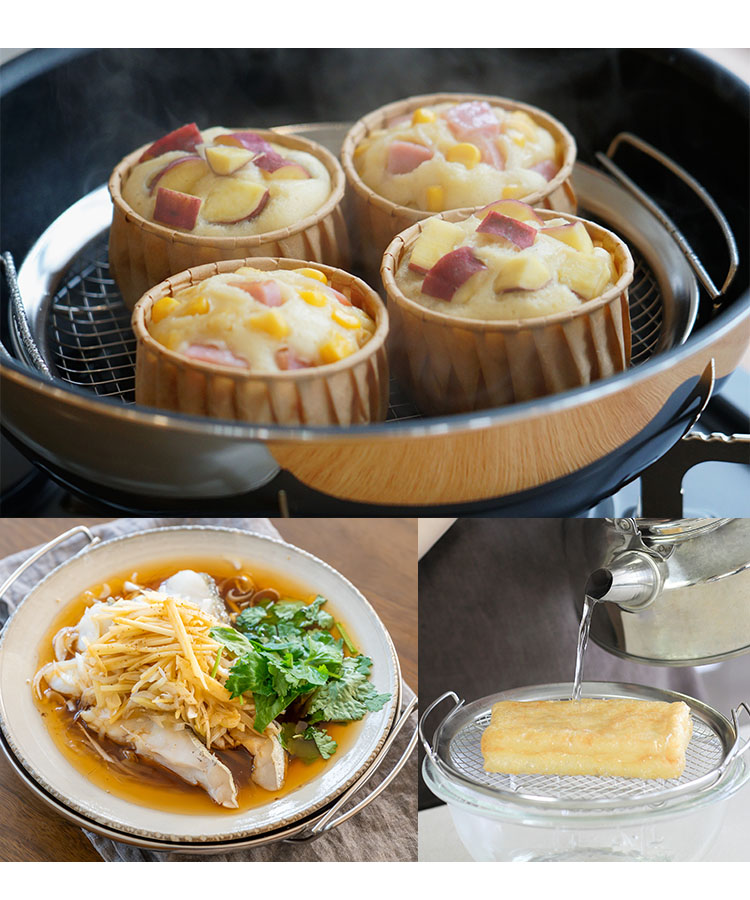 | おうちのフライパンで手軽に蒸し料理ができる「蒸しかご」。 蒸し料理は、簡単なのにヘルシーで食材の栄養価を損なわず調理でき、いいことづくし。 フライパンの底面に水をためて、食材を乗せた蒸しかごを置き、フタをして沸騰させるだけ。 24cm以上のフライパンで使え、野菜や肉まん、ふかし芋などが手軽に調理できます。 網なので水切れがよく、食材を洗ったり下ごしらえなどにも活躍。 フライパンから取り出してお皿にのせれば、そのまま食卓にも出すことができます。 セイロや蒸し器を用意することなく、お手持ちのフライパンと「蒸しかご」で毎日でも気軽に蒸し料理を楽しむことができます。 |
