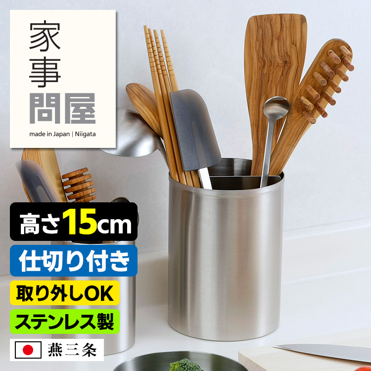 | 広口で安定感あるステンレス製ツールスタンド。 仕切りがあるので中で絡みにくく、調理や食事の準備がはかどります。仕切りは取り出して丸洗いでき、清潔にお使いいただけます。 「ツールスタンド 15cm」はフライ返しやお玉などの柄が長いいキッチンツールの収納にちょうどよいサイズ感です。 |