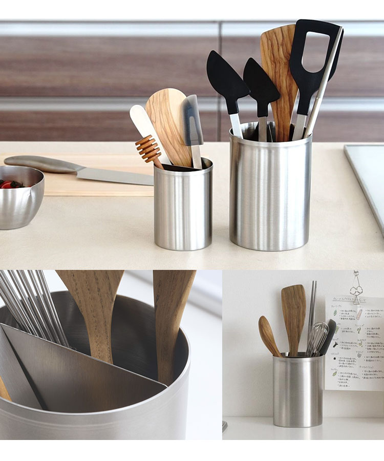 ![]() 装飾がなくシンプルな円筒形のデザイン。取り外しできる仕切りで使い勝手が各段にアップ。 キッチンツールをまっすぐ立てやすく、たくさんのお箸やスプーン、フォークを差しても乱れにくくスッキリ取り出しやすい状態をキープできます。 |