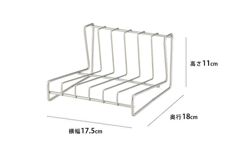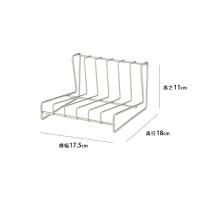 | 普段使いで出番の多い6寸〜8寸(直径18〜24cm)のお皿が6枚立てられます。 上からも横からも取り出せるようL字型に設計。ステンレス製ですが器と触れたときにカチャカチャ音がしないよう、透明のポリエチレンコーティングが施されています。 |