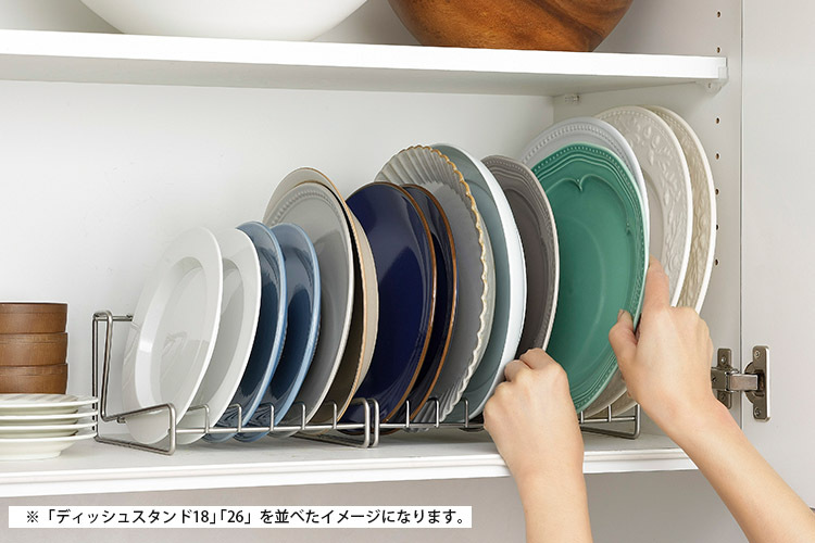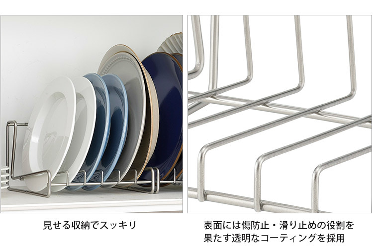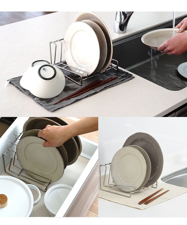 ![]() 食器棚の中では収納ラックとして活躍。水切れがよく錆びにくいステンレス製なので、シンク周りに置けば水切り用のスタンドに早変わり。 (※深さのあるお皿やオーバルプレートも収納可能ですが、お皿のサイズが大きくなりすぎると不安定になりますのでご注意ください。) |
