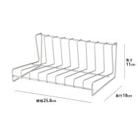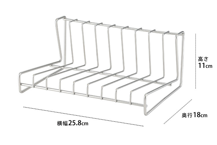 | 普段使いで出番の多い6寸〜8寸(直径18〜24cm)のお皿が9枚立てられます。 上からも横からも取り出せるようL字型に設計。ステンレス製ですが器と触れたときにカチャカチャ音がしないよう、透明のポリエチレンコーティングが施されています。 |
