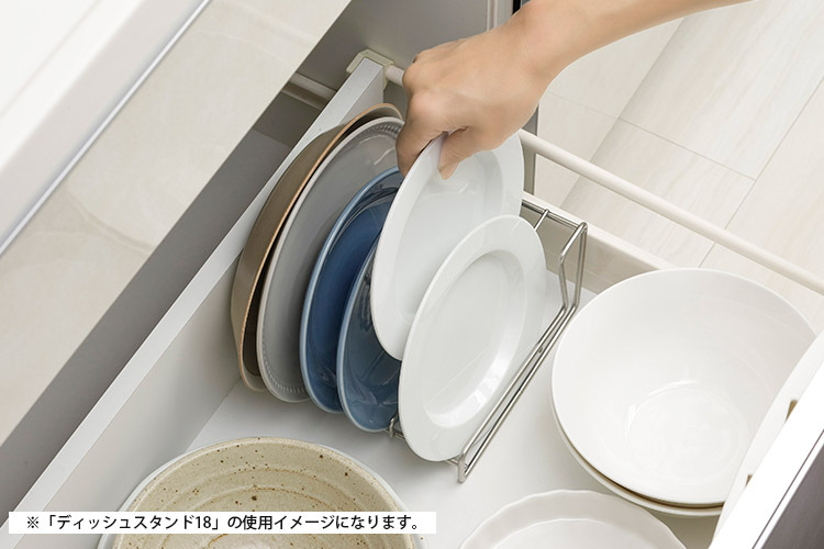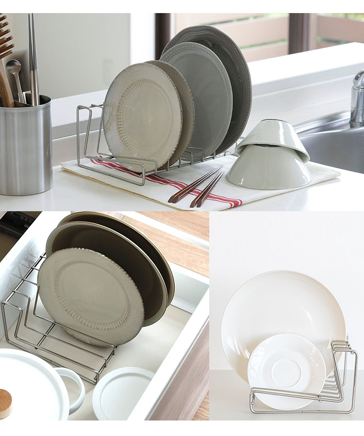 ![]() 食器棚の中では収納ラックとして活躍。水切れがよく錆びにくいステンレス製なので、シンク周りに置けば水切り用のスタンドに早変わり。 (※深さのあるお皿やオーバルプレートも収納可能ですが、お皿のサイズが大きくなりすぎると不安定になりますのでご注意ください。) |