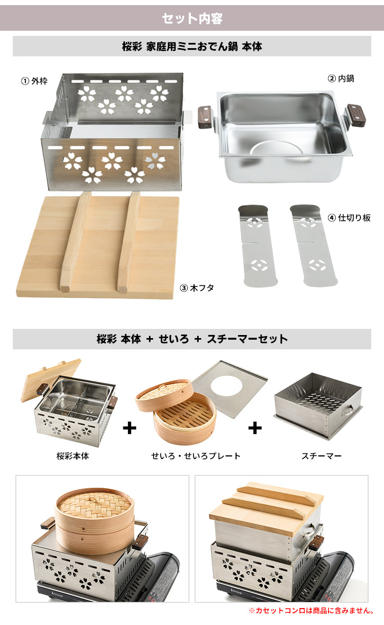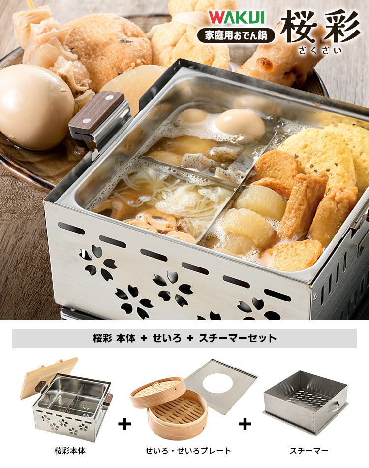 | 商品名 | ワクイ 桜彩(さくさい) 家庭用ミニおでん鍋 せいろ・スチーマー付セット |