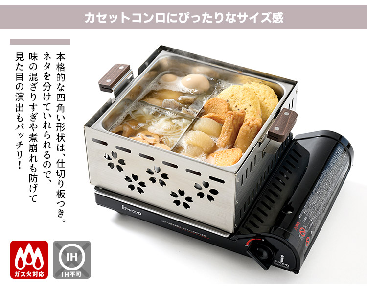 | 【正規販売店】まるで居酒屋!おうちで楽しむ本格おでん鍋。カセットコンロにぴったりなサイズ感で、具材をきれいに分けられる仕切り板付き。食卓に並べるだけでおでん屋さん気分。 |