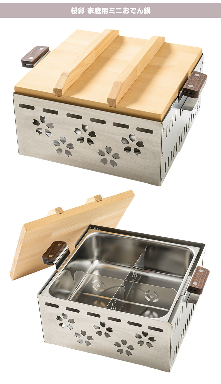 | ● 専門店気分を演出するデザイン&サイズ感 日本の象徴、桜をモチーフとしたデザインと、カセットコンロにピッタリなサイズ感で、お店の雰囲気を演出。 いつでもどこでも、これ1つでおでん屋さん気分が楽しめます。 ● より美味しく美しく取り外し可能な仕切り板付 取り外し可能なステンレス製の仕切り板付き。 具材がきれいに分けられるのはもちろん、味の混ざりすぎや煮崩れも防げて、最後までおいしく、きれいに楽しめます。 ● 丈夫で保温性もバツグンなステンレス製 ステンレスは錆びにくく、耐久性に優れ、お手入れが簡単。 また他の金属に比べ保温性が高く、あつあつのおでんを長く楽しむことができます。 ● 安心のMadeinJapan 燕三条製品 金属加工で知られる新潟・燕三条にあるWAKUIが、企画から製造までをすべて自社で一貫対応。 職人の手で一つひとつ、丁寧につくり上げています。 |