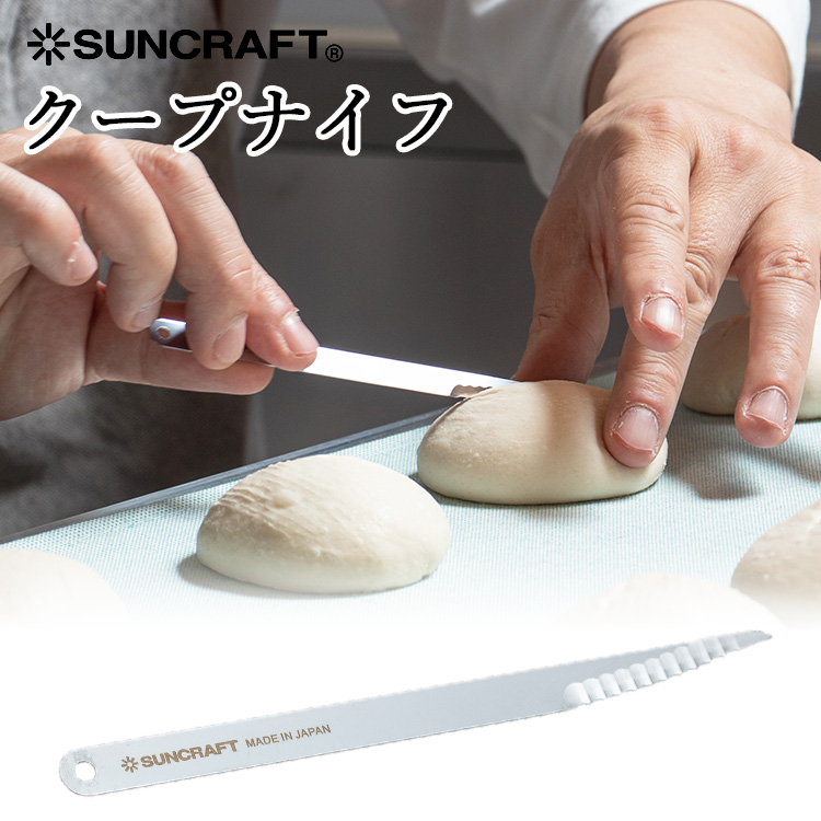 | クープ入れは、パン窯やオーブン入れの直前に手早く行う工程で、時間がかかってしまうと、せっかく状態の良い生地でも台無しになってしまいます。 サンクラフトのクープナイフは刃物産地岐阜県関市の刃物づくりのノウハウが詰め込まれたナイフ。一度で素早くクープが入るので、窯入れまでスムーズです。 繊細な飾り切りでも活躍する作業性の良さで、表現の幅が広がること間違いなしです。 |