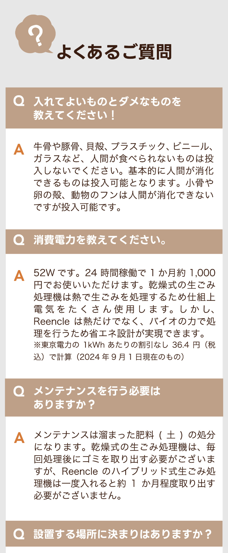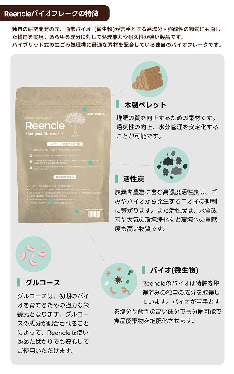 | これまでの生ごみだけでなく、自然由来の素材も投入可能に! 新たに投入できるものとして、紙、段ボール、割り箸などが追加され、使い勝手がさらに向上しました。 コーヒーパック、紙皿・紙コップ、トイレットペーパーに包んだペットのうんちなどもそのまま処理できます。これにより、家庭でのゴミ処理がより便利になり、利用できるシーンが広がります。 ※プラスチックやガラスなど微生物が分解できないものは引き続き投入不可です。 ● Reencleから生まれる堆肥(副産物)の活用法 Reencleから生まれる堆肥は、研究結果により土壌改良資材としての役割を持つことがわかりました。 この堆肥は「残渣処理」「防虫効果」「作物の成長促進」に効果があり、家庭菜園や畑での使用に非常に適しています。 特に最近では、化学肥料の価格が高騰しており、自然な方法で土壌改良を行いたい方にとって、Reencleで作られる活きた微生物入りの土壌改良資材は非常に便利で経済的です。 一般的な肥料を購入することなく何度でも無料で手に入れることができるため、家庭菜園や畑を育てる方々におすすめです。 |