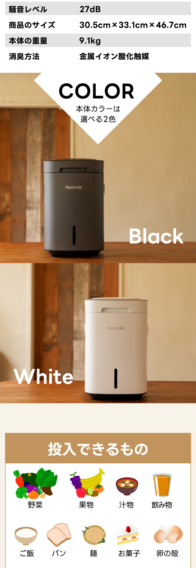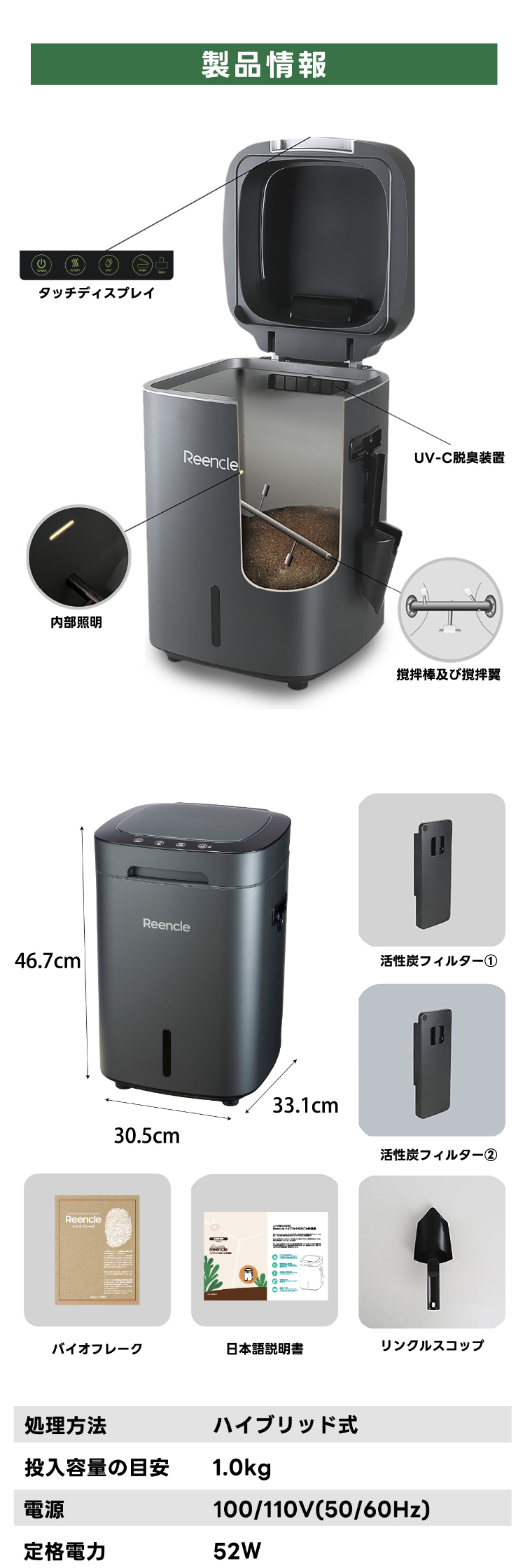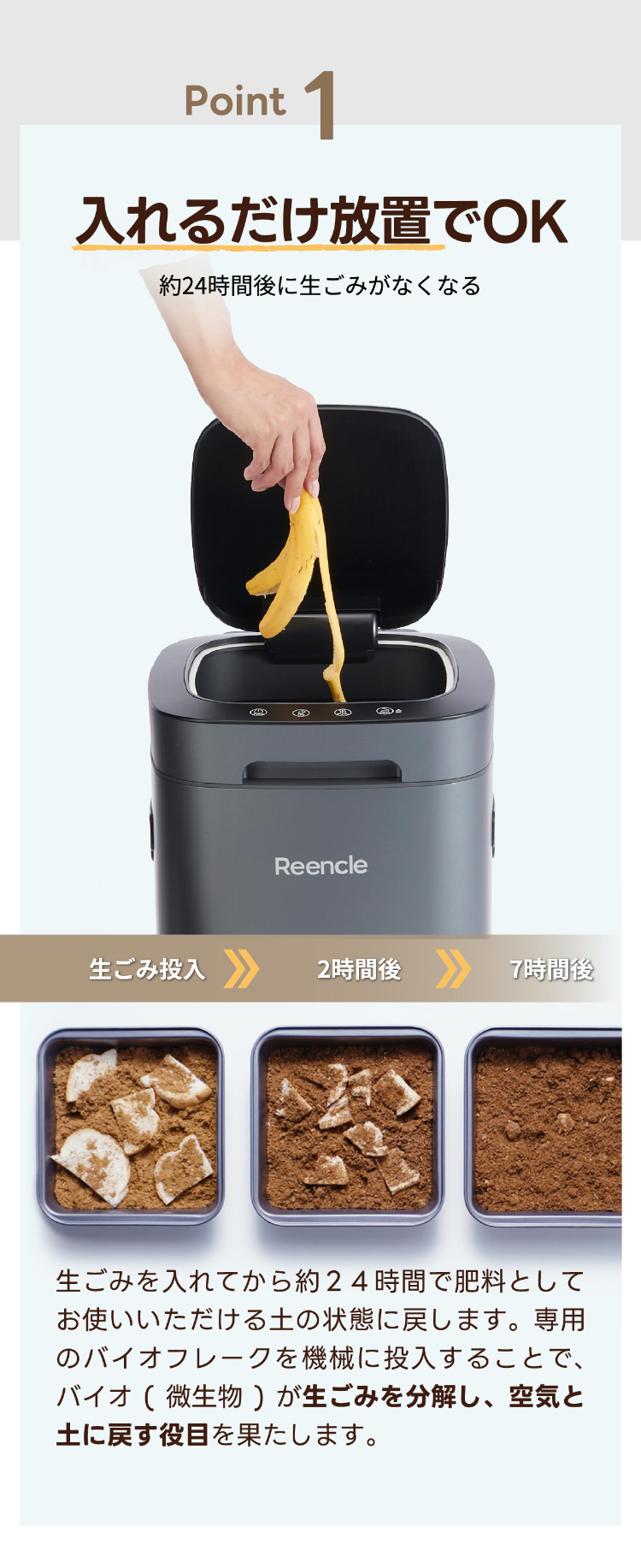 | 生ごみを入れてから約24時間で肥料としてお使いいただける土の状態に戻します。 1日1.7kgまで処理可能で7人家族まで対応可能です。 投入したごみは空気と水に分解され、残りが堆肥となります。家庭菜園などの肥料としてお使いいただくか燃えるゴミとして処分いただけます。 投入したゴミを毎回取り出す必要はなく、機械一杯にたまったタイミング(約1カ月〜)で処分していただく方式のため手間がほとんどかかりません。 ● 強力脱臭システム Reencleの生ごみ処理機は4層もの消臭システムを採用し、 01.脱臭効果の専用バイオフレーク 02.高濃度イオン酸化触媒(TiO2)搭載の排気フィルター 03.活性炭フィルター 04.UV-C脱臭装置 の順番で徹底的に匂いを取り除きます。また自動消臭装置を内蔵しているため排気管は不要です。 ● 25db以下の消音設計 冷蔵庫よりも静かな処理音を実現いたしました。 乾燥式の生ごみ処理機は熱を加えて処理を行うため、処理中のモーター音が発生いたします。 しかし、Reencleの生ごみ処理機はハイブリッド式で内部の攪拌がゆっくりと回転しバイオの力で処理を行うため、処理音を最小限に抑えることができます。 ● 省エネ設定 消費電力は52W。一般的な乾燥式の生ごみ処理機の1/3、バイオ式の1/2の消費電力を実現しました。 熱を加えて乾燥処理を行う乾燥式に比べ、熱とバイオの力で処理を行うための家計にも優しい省エネ仕様に設計されています。 ● 安心安全1年保証 皆様に安心してお使いいただけるように1年間の保証をご用意しております。 【こんな方におススメ】 ・生ゴミの臭いやコバエに悩んでいる方 ・家庭菜園やガーデニングを楽しんでいる方 ・環境に配慮した生活を心がけている方 ・生ゴミ処理時の静かな動作を求める方 ・ごみの量を減らしたい方 |