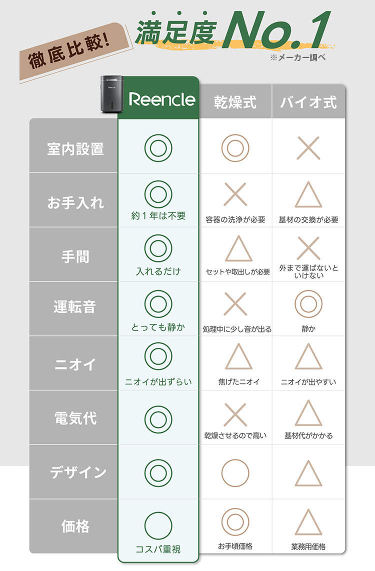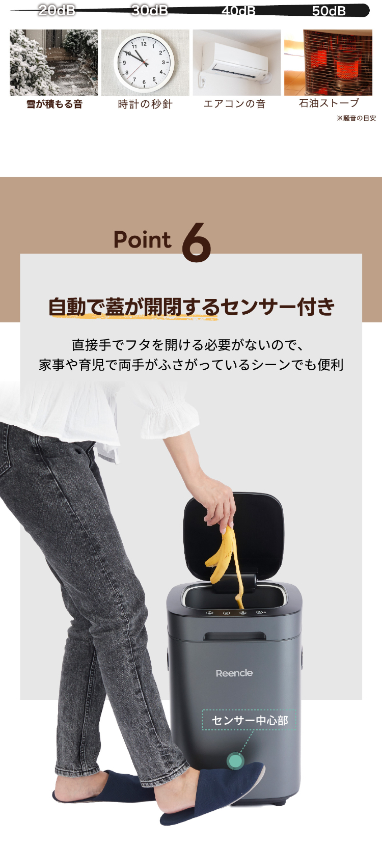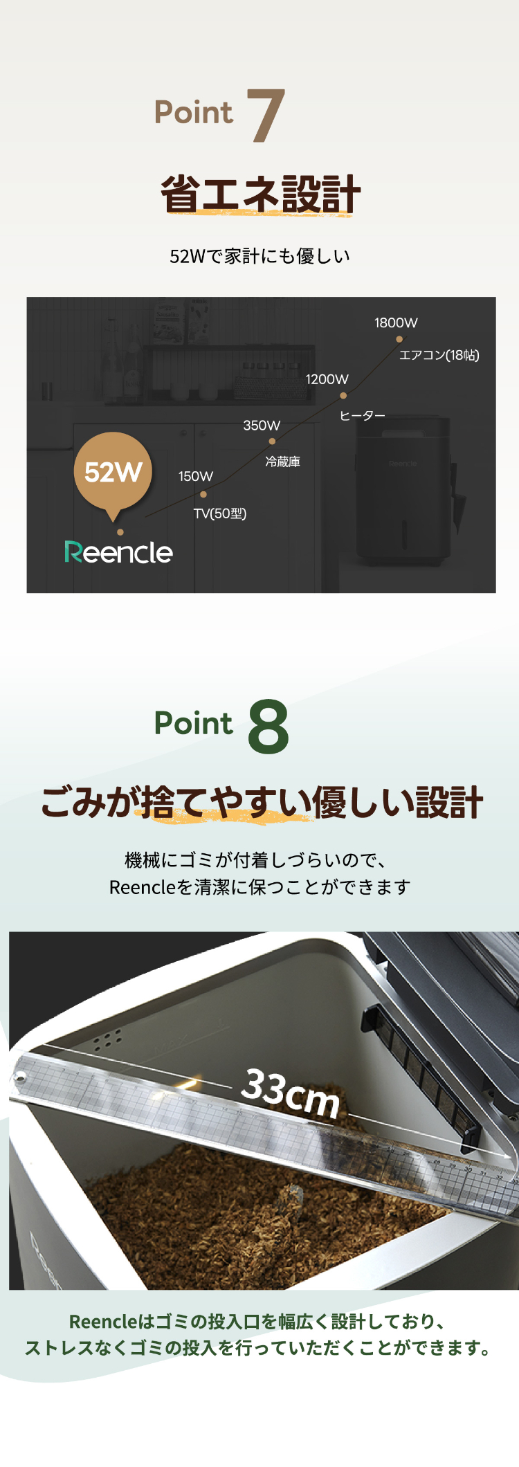 | 生ごみを入れてから約24時間で肥料としてお使いいただける土の状態に戻します。 1日1.7kgまで処理可能で7人家族まで対応可能です。 投入したごみは空気と水に分解され、残りが堆肥となります。家庭菜園などの肥料としてお使いいただくか燃えるゴミとして処分いただけます。 投入したゴミを毎回取り出す必要はなく、機械一杯にたまったタイミング(約1カ月〜)で処分していただく方式のため手間がほとんどかかりません。 ● 強力脱臭システム Reencleの生ごみ処理機は4層もの消臭システムを採用し、 01.脱臭効果の専用バイオフレーク 02.高濃度イオン酸化触媒(TiO2)搭載の排気フィルター 03.活性炭フィルター 04.UV-C脱臭装置 の順番で徹底的に匂いを取り除きます。また自動消臭装置を内蔵しているため排気管は不要です。 ● 25db以下の消音設計 冷蔵庫よりも静かな処理音を実現いたしました。 乾燥式の生ごみ処理機は熱を加えて処理を行うため、処理中のモーター音が発生いたします。 しかし、Reencleの生ごみ処理機はハイブリッド式で内部の攪拌がゆっくりと回転しバイオの力で処理を行うため、処理音を最小限に抑えることができます。 ● 省エネ設定 消費電力は52W。一般的な乾燥式の生ごみ処理機の1/3、バイオ式の1/2の消費電力を実現しました。 熱を加えて乾燥処理を行う乾燥式に比べ、熱とバイオの力で処理を行うための家計にも優しい省エネ仕様に設計されています。 ● 安心安全1年保証 皆様に安心してお使いいただけるように1年間の保証をご用意しております。 【こんな方におススメ】 ・生ゴミの臭いやコバエに悩んでいる方 ・家庭菜園やガーデニングを楽しんでいる方 ・環境に配慮した生活を心がけている方 ・生ゴミ処理時の静かな動作を求める方 ・ごみの量を減らしたい方 |